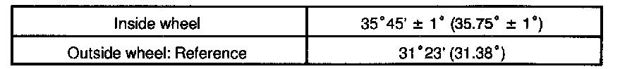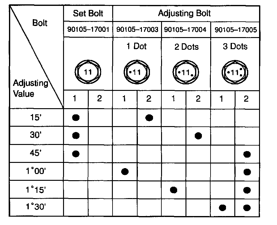 If the camber is not within the specified value, using the table, estimate how much additional camber adjustment will be required, and select the camber adjusting bolt.