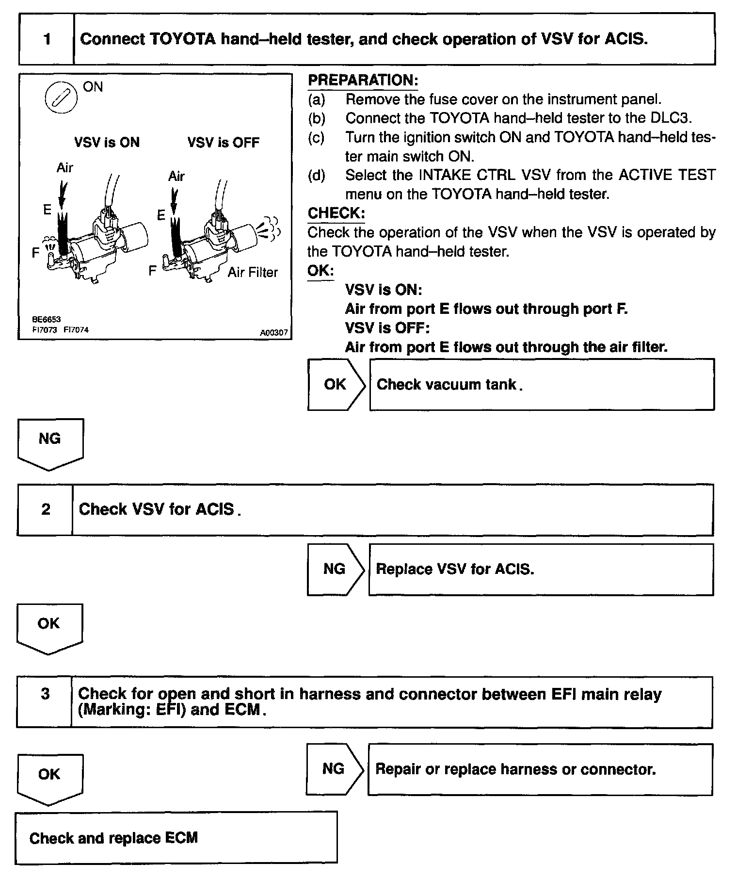 When the engine speed is 3,700 rpm or less and the throttle valve opening angle is 300 or more, the ECM turns the two VSV ON or OFF and operate the IACV.