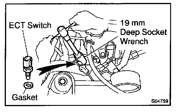 b. Using a 19 mm deep socket wrench, remove the ECT sensor and gasket.