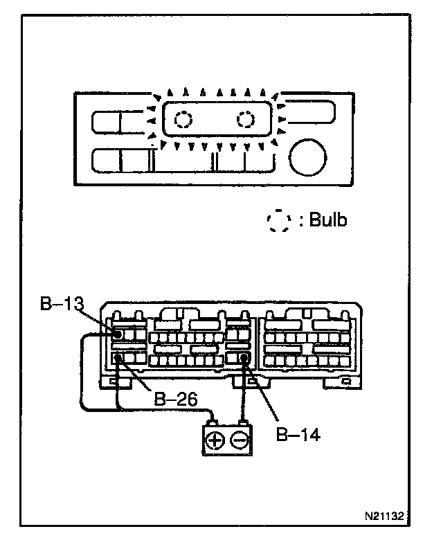 Connect the positive (+) lead from the battery to terminal B-13, B-26 and the negative (-) lead to terminal B-14, then check that the illumination lights up.
