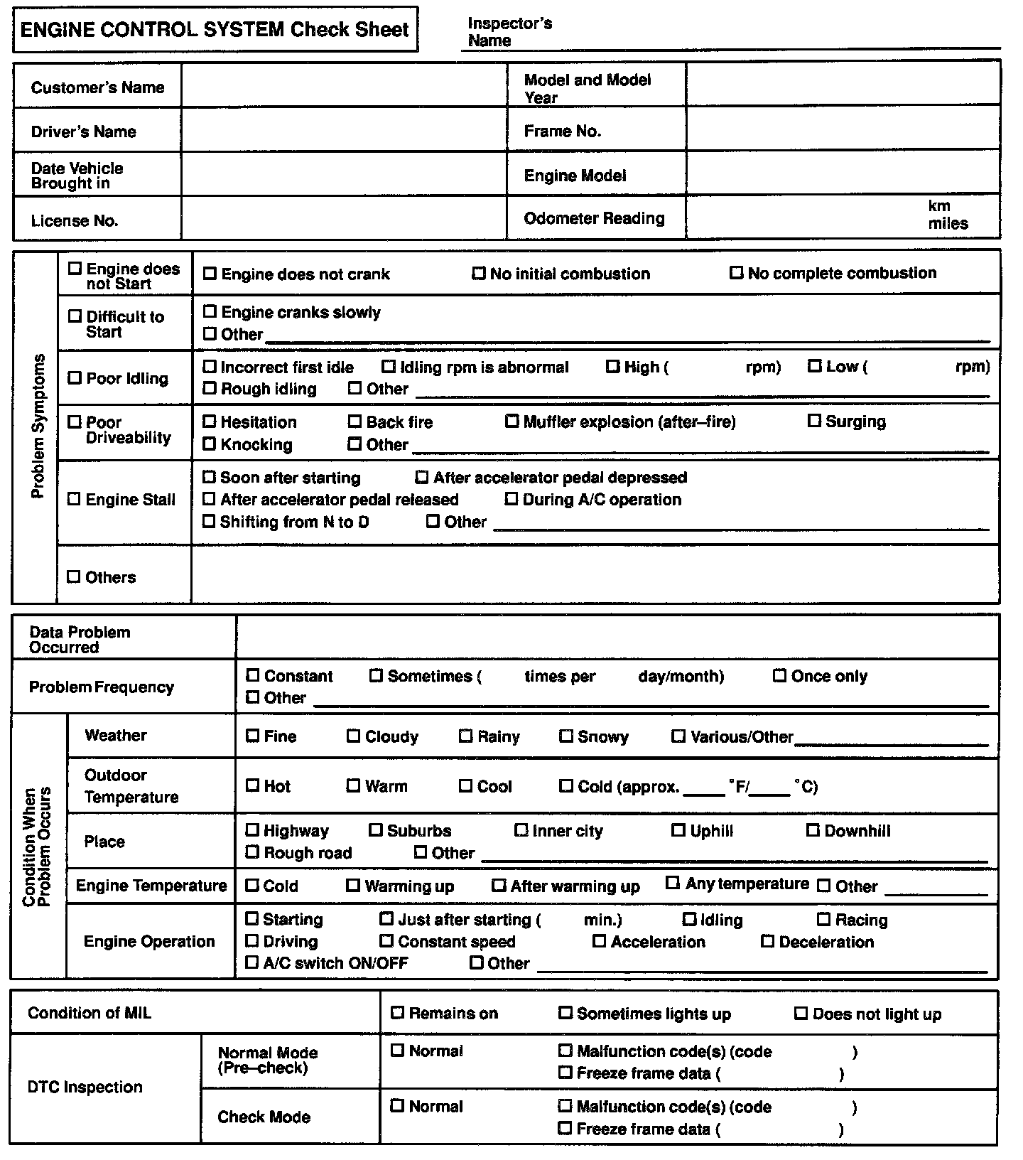 Engine Control System Check Sheet: