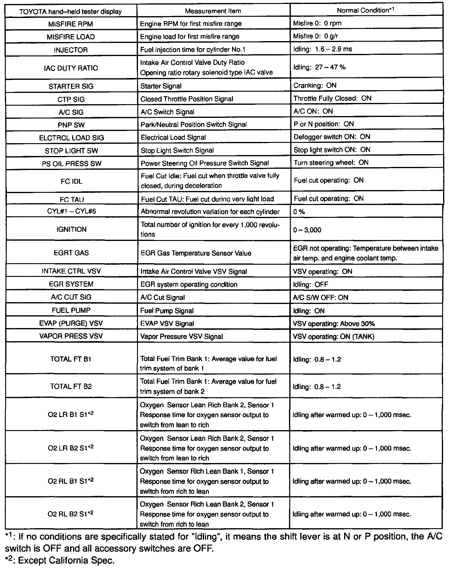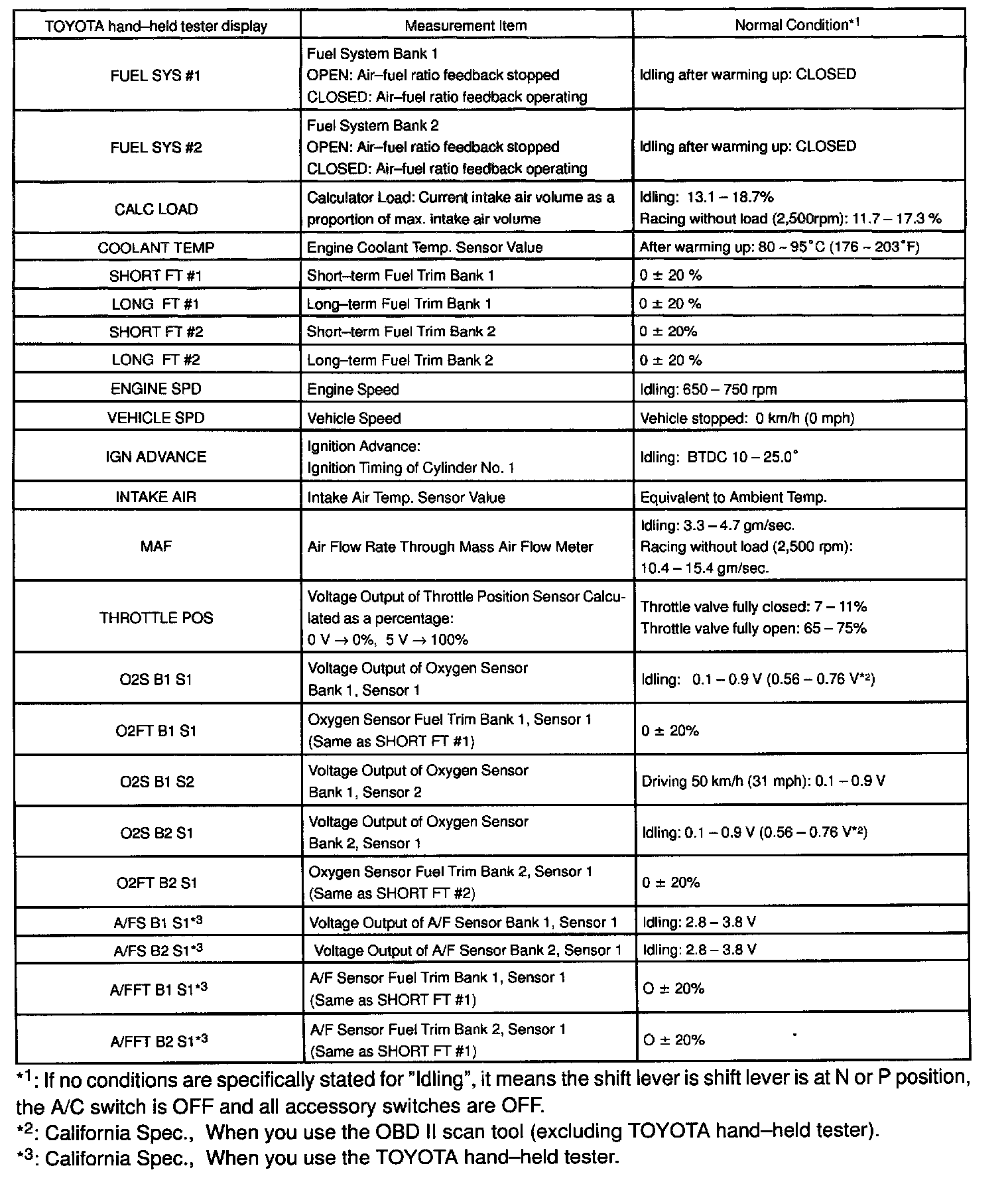 NOTE: The values given below for "Normal Condition" are representative values, so a vehicle may still be normal even if its value varies differ from those listed here. So do not decide whether a part is faulty or not solely according to the "Normal Condition" here.