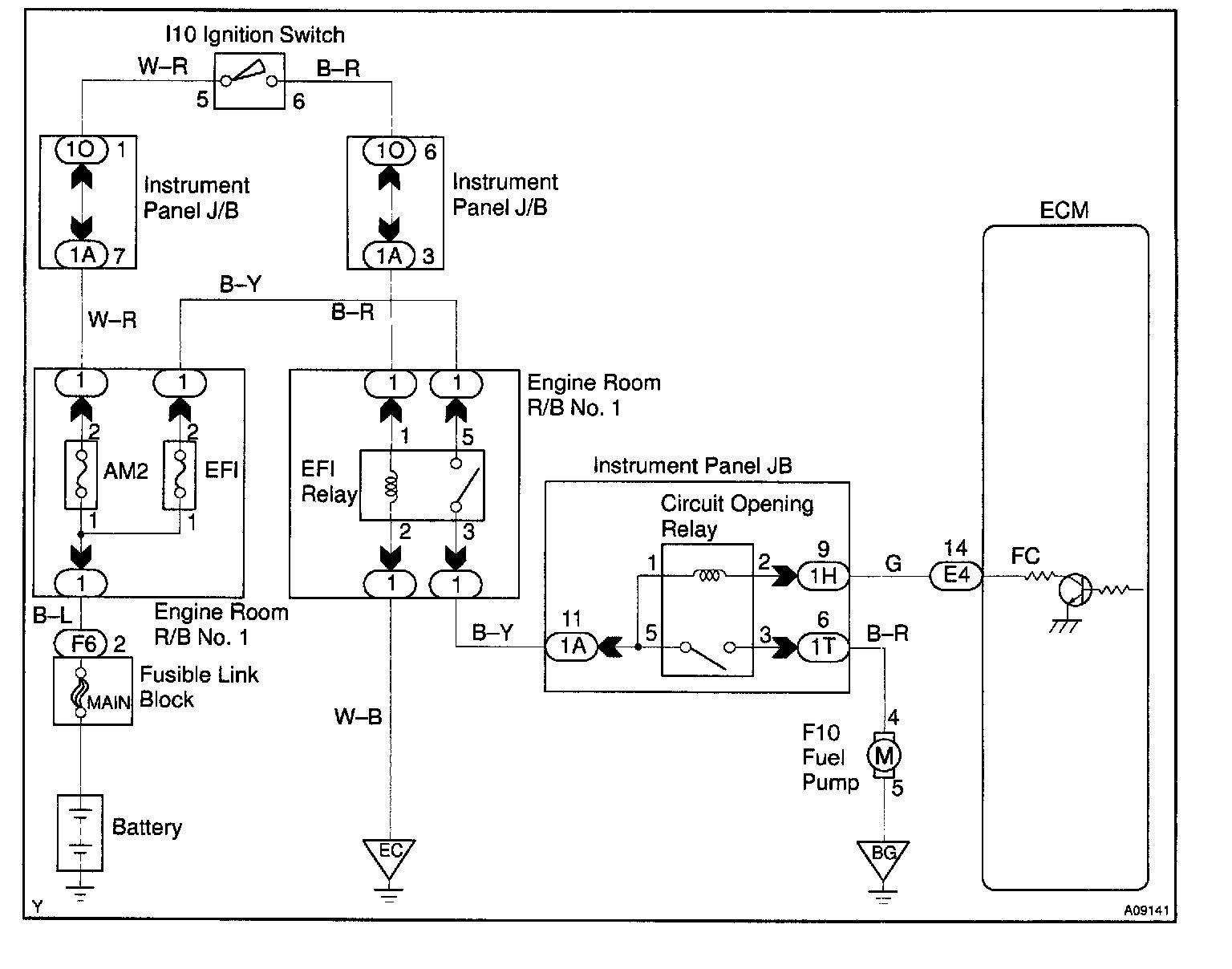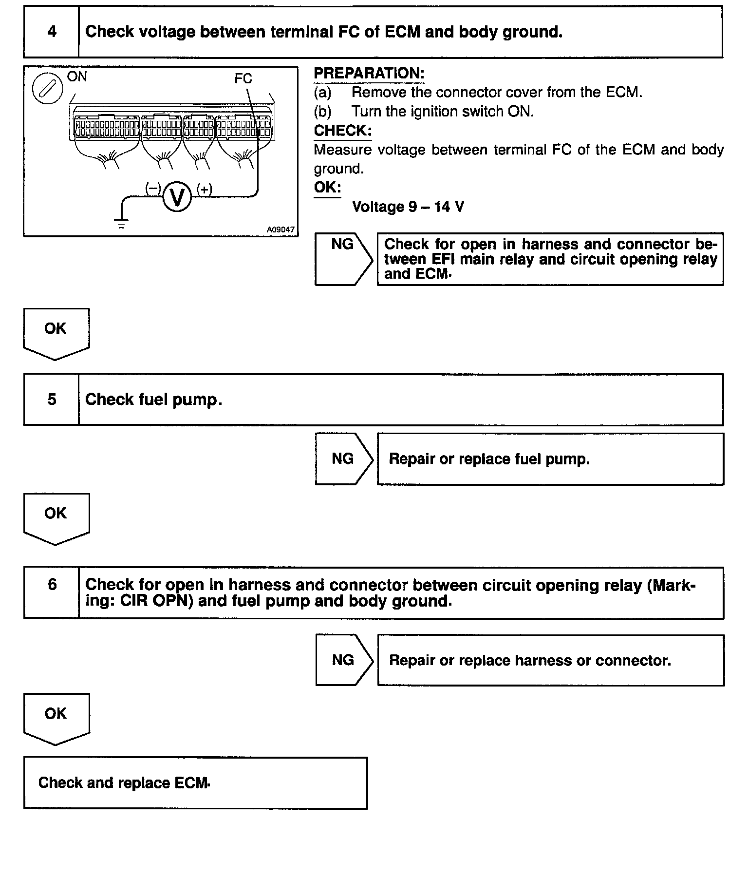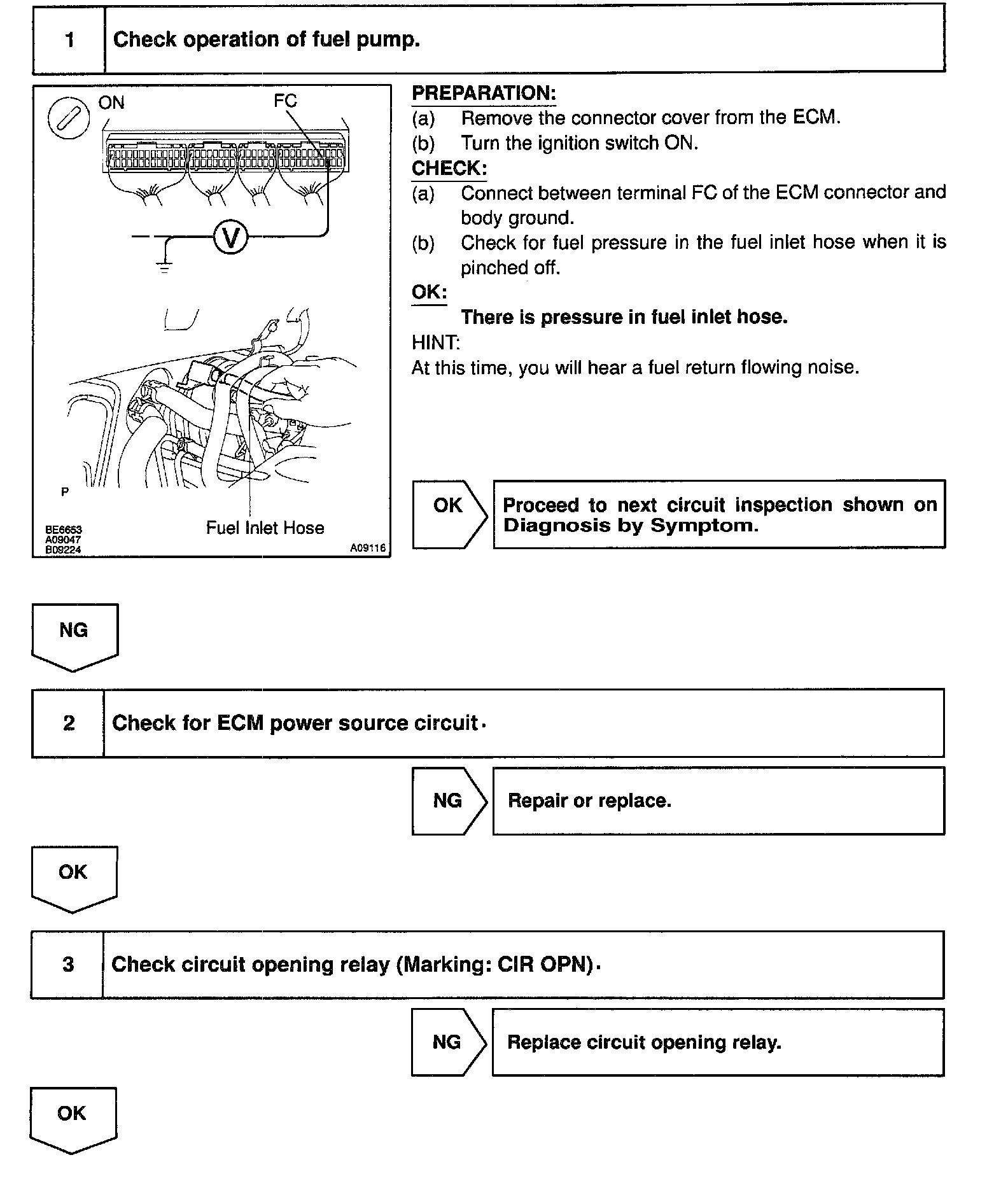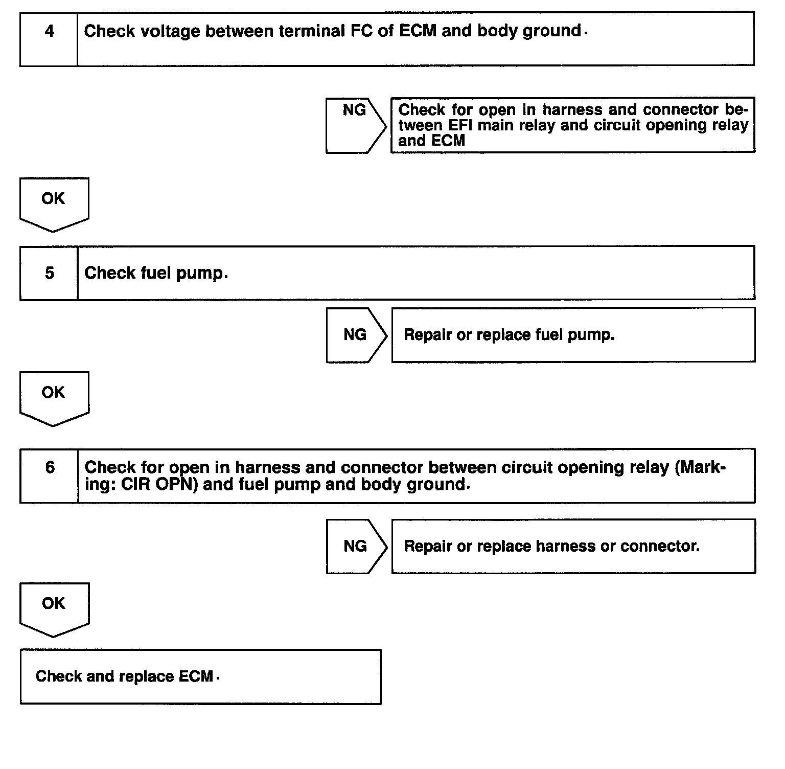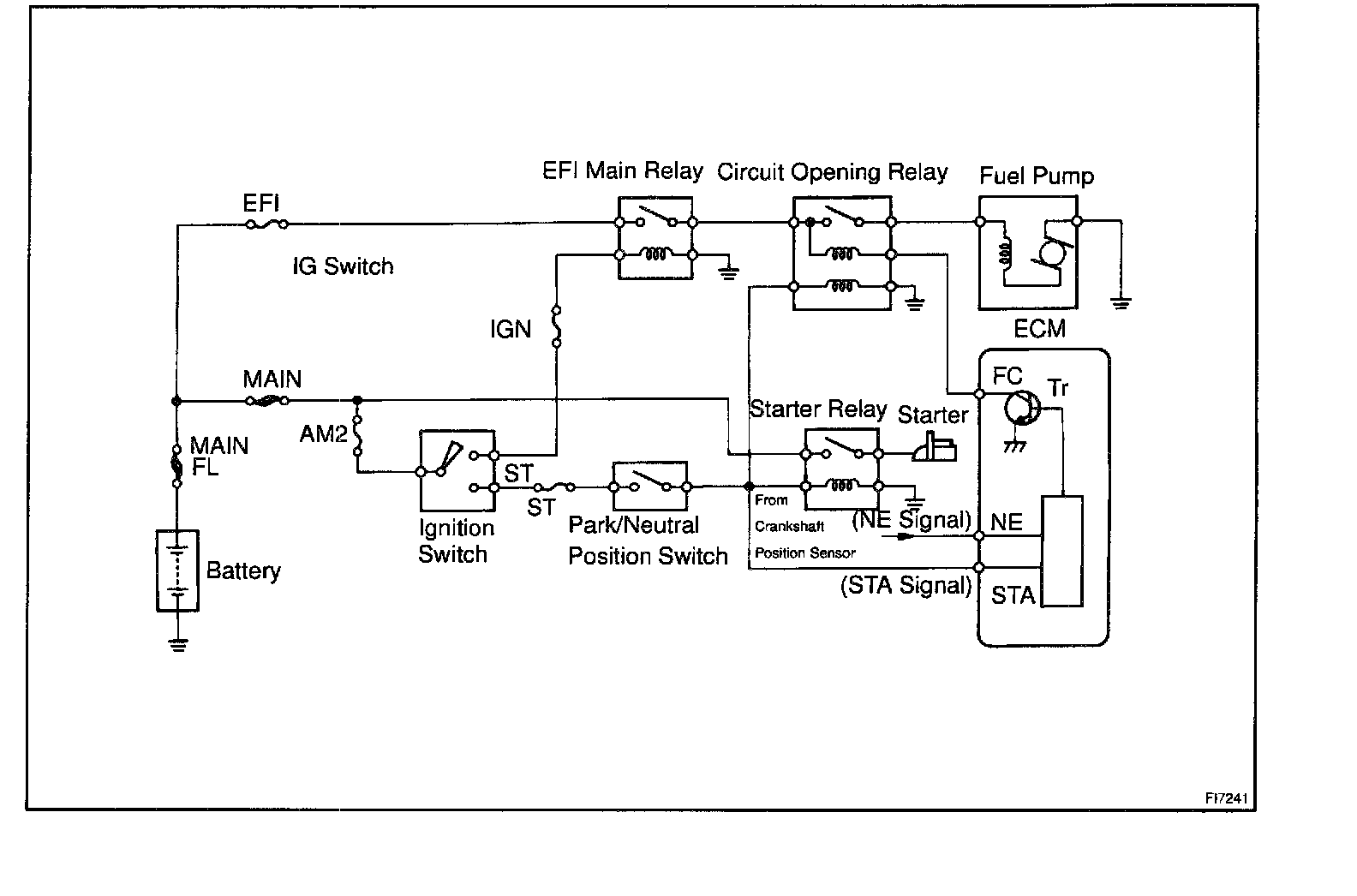 When the STA signal and NE signal are input to the ECM, Tr is turned ON, current flows to coil of the circuit opening relay, the relay switches on, power is supplied to the fuel pump and the fuel pump operates. While the NE signal is generated (engine running), the ECM keeps Tr ON (circuit opening relay ON) and the fuel pump also keeps operating.