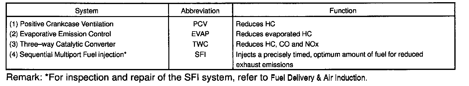 PURPOSEThe emission control Systems are installed to reduce the amount of CO, HC and NOx exhausted from the engine ((3) and (4)), to prevent the atmospheric release of blow-by gas-containing HC (1) and evaporated fuel containing HC being released from the fuel tank (2).