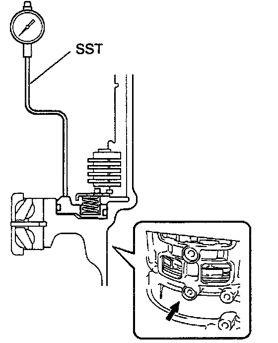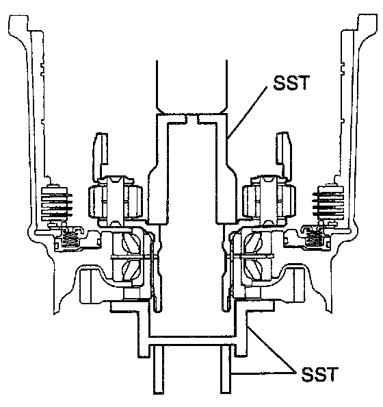 Using a dial indicator and measuring terminal Special Service Tool (SST), measure the 1st & reverse brake piston stroke while applying and releasing compressed air (392 - 785 kPa, 4 - 8 kgf/cm2, 57 - 114 psi).
