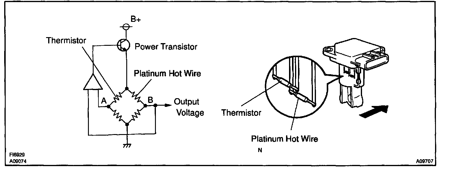 The air flow meter uses a platinum hot wire. The hot wire air flow meter consists of a platinum hot wire, thermistor and a control circuit installed in a plastic housing. The hot wire air flow meter works on the principle that the hot wire and thermistor located in the intake air bypass of the housing detect any changes in the intake air temperature.
