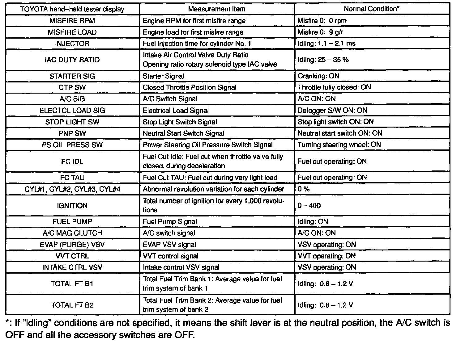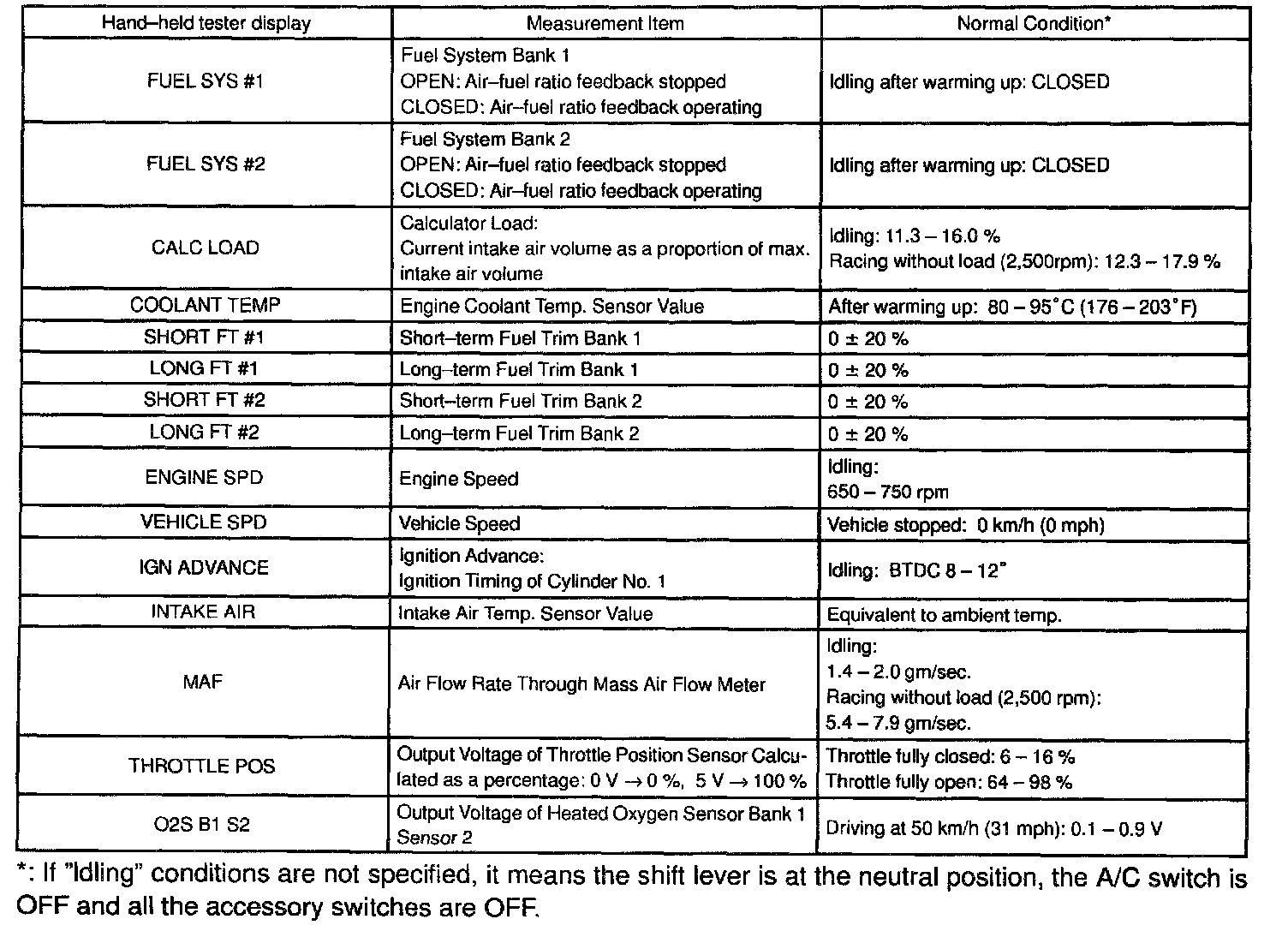 NOTE: The values given for "Normal Condition" are representative values, so a vehicle may still be normal even if its value differs from those listed here. So do not depend solely on the "Normal Condition" here when deciding whether the part is faulty or not.