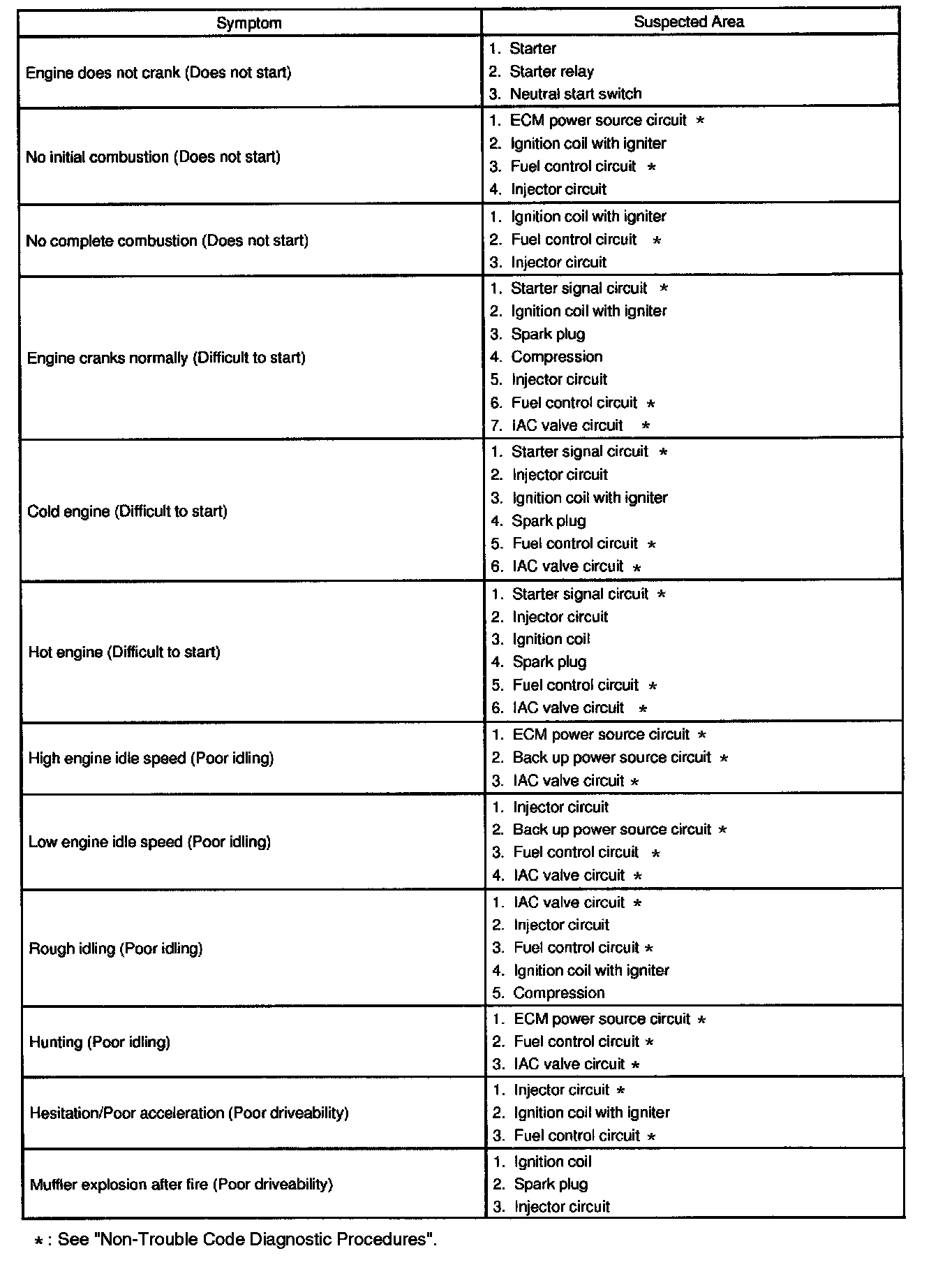 When the malfunction is not confirmed in the DTC check and the problem still can not be confirmed in the basic inspection either, proceed to this problem symptoms table and troubleshoot according to the number given.