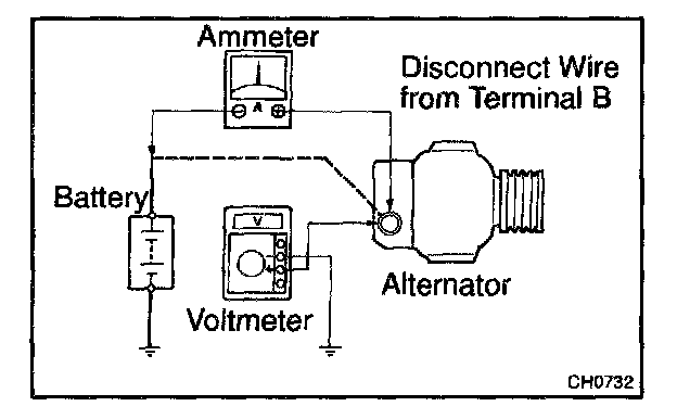 1. Disconnect the wire from terminal B of the alternator, and connect it to the negative (-) tester probe of the ammeter.