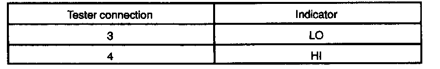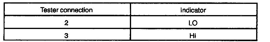 1. Connect the positive (+) lead from the battery to terminal 1 and negative (-) lead to each terminal, then check that the "LO" and "HI" indicators light up as shown in the chart.