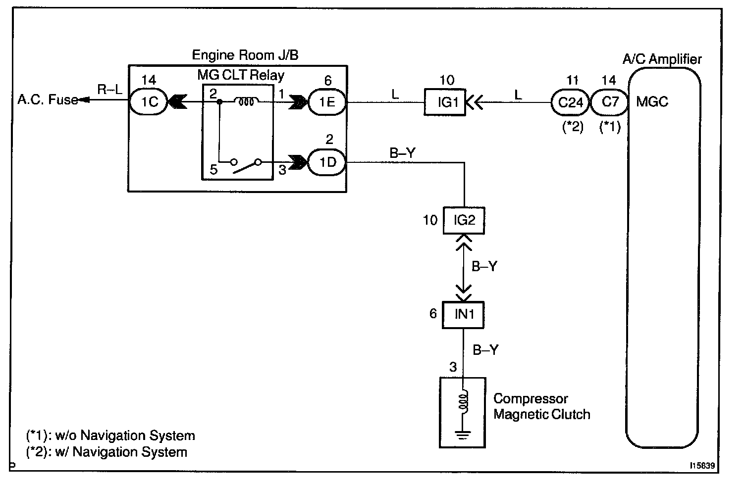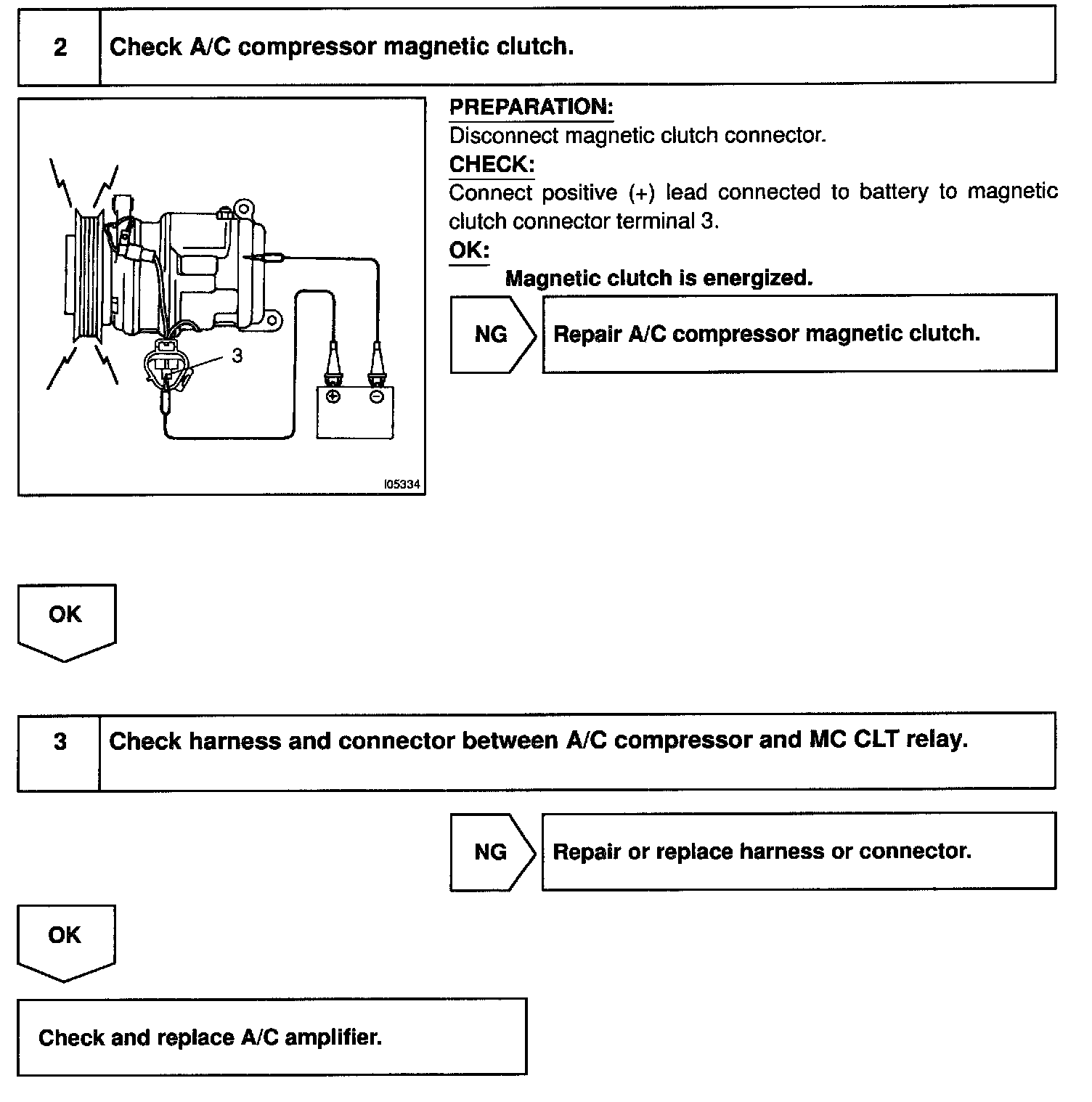 A/C amplifier switches the A/C magnetic clutch relay ON, thus turning the A/C compressor magnetic clutch ON.