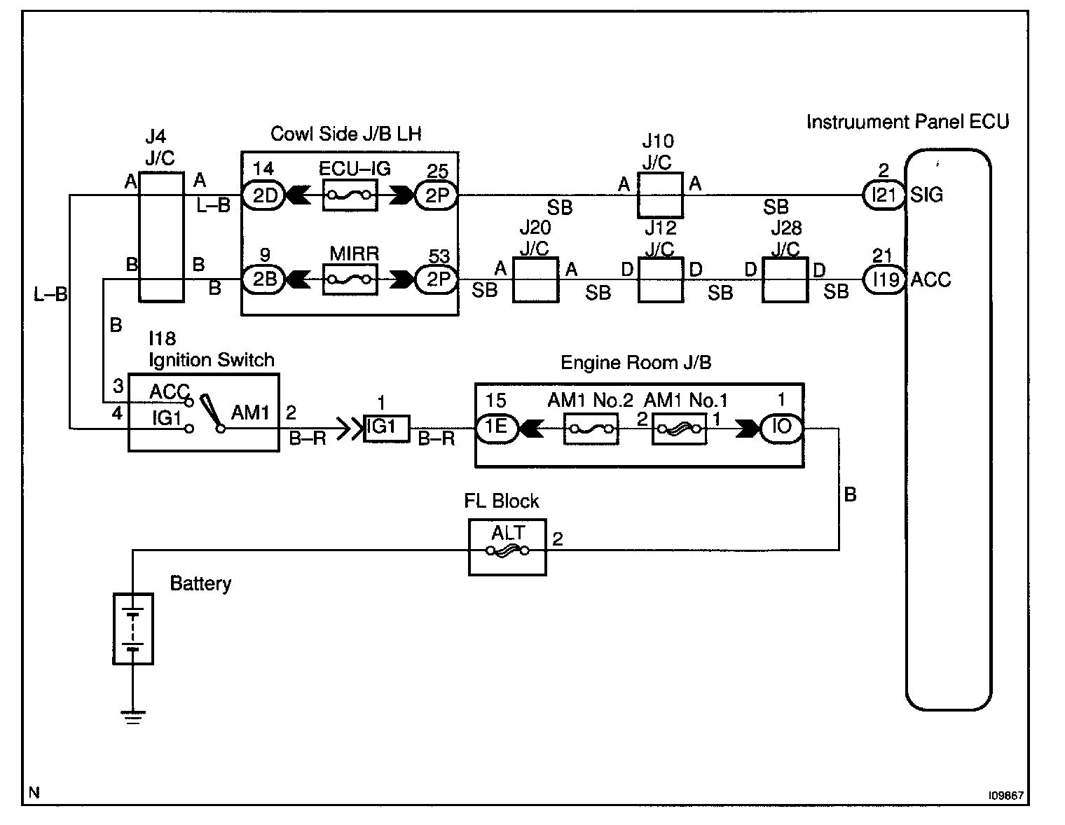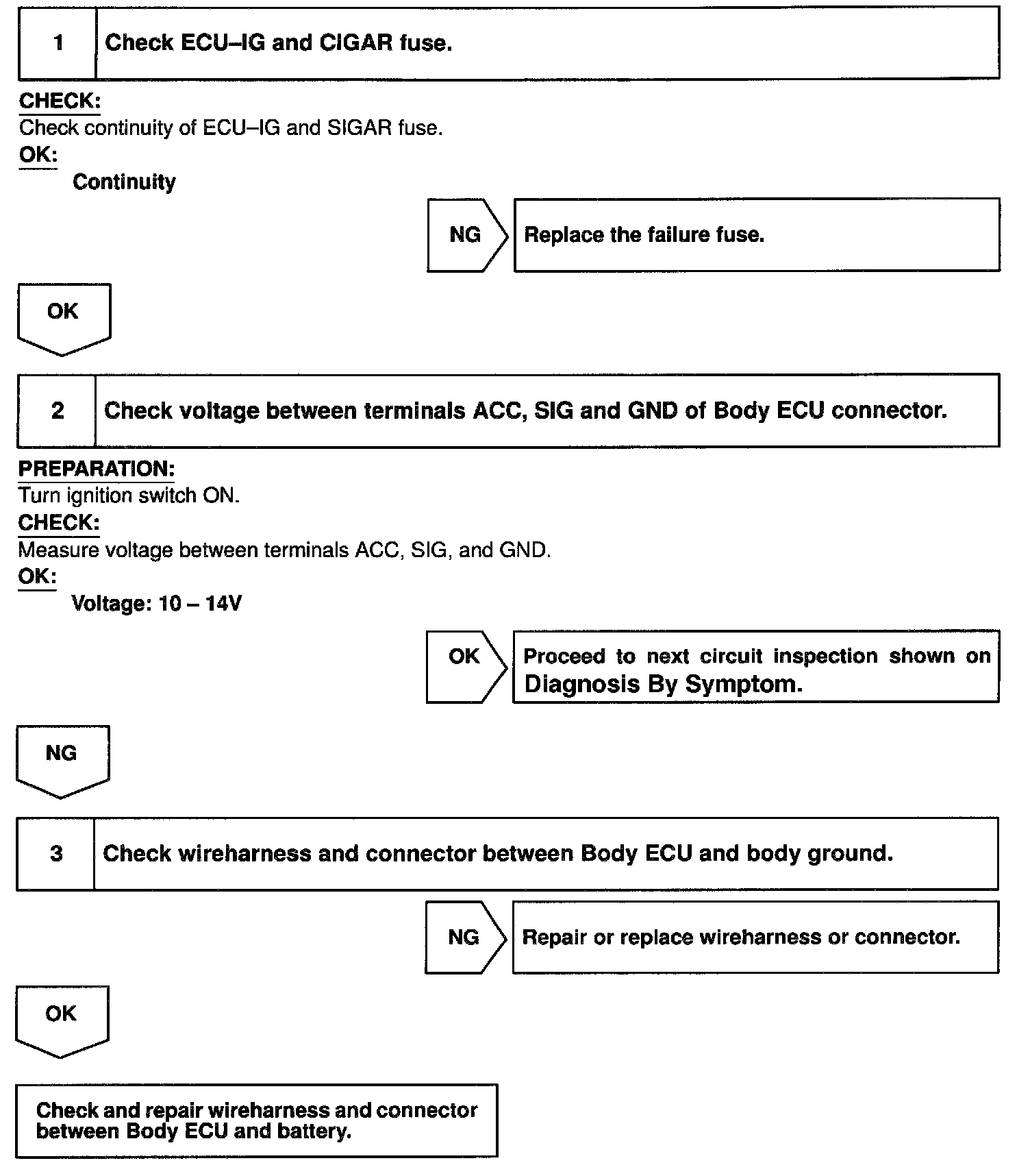 CIRCUIT DESCRIPTIONWhen the ignition switch is turned to the ACC position, battery positive voltage is applied to the terminal ACC of the ECU and when the ignition switch is turned to the ON position, battery positive voltage is applied to the terminal SIC of the ECU.