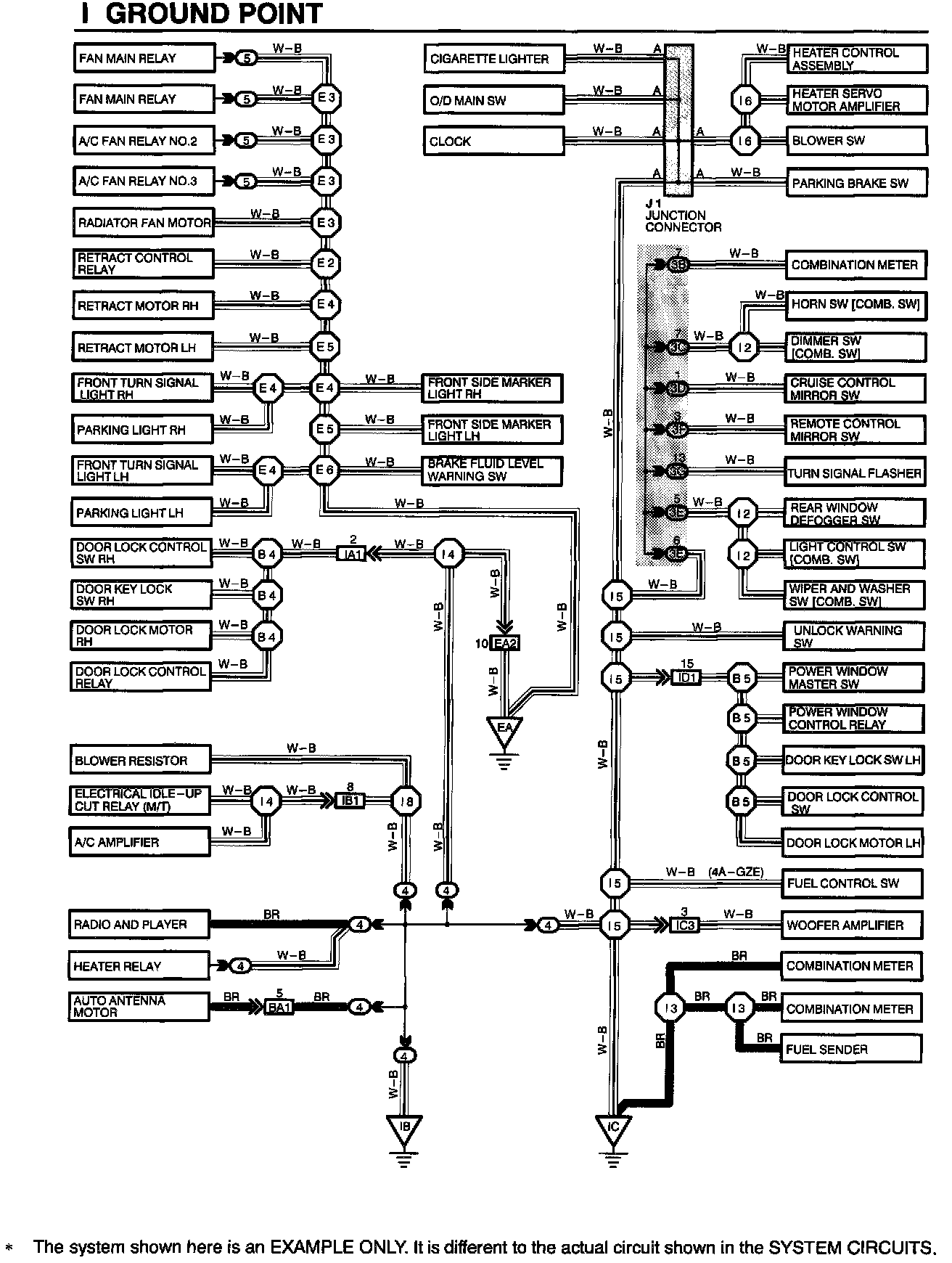 The ground points circuit diagram shows the connections from all major parts to the respective ground points. When troubleshooting a faulty ground point, checking the system circuits which use a common ground may help you identify the problem ground quickly. The relationship between ground points ( (EA), (IB) and (IC) shown below) can also be checked this way.