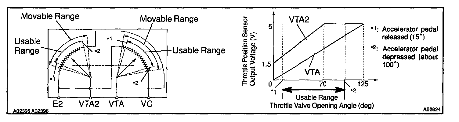 The ECM judges the current opening angle of the throttle valve from these signals input from terminals VTA and VTA2, and the ECM controls the throttle motor to make the throttle valve angle properly in response to driving condition.