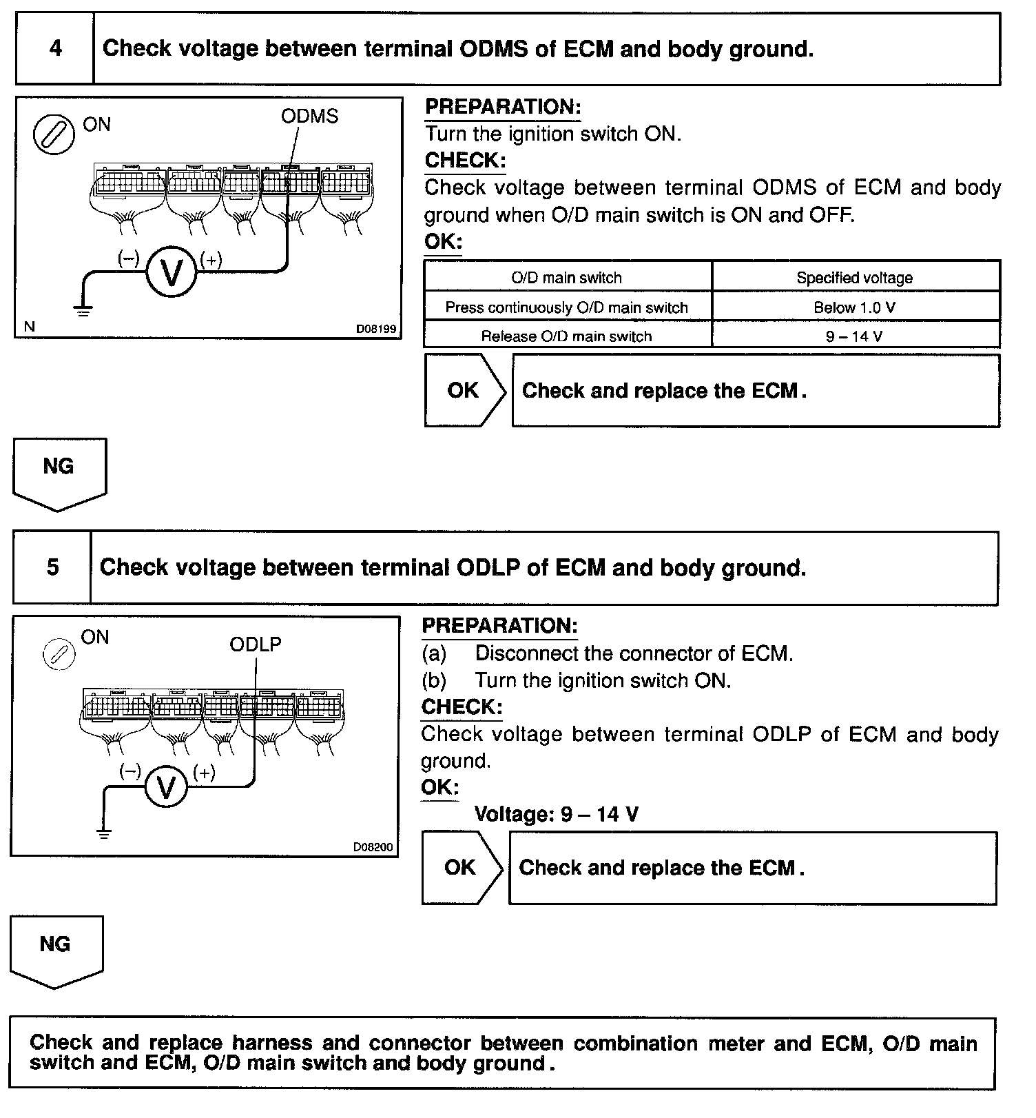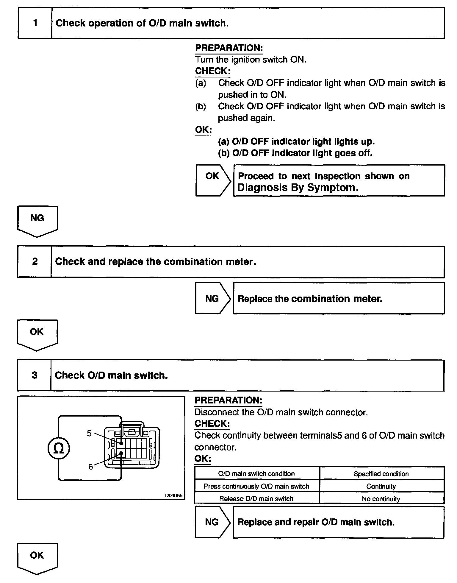 The O/D main switch is a momentary type switch. When pressing the O/D OFF main switch, the O/D OFF indicator light lights up and ECM prohibits shifting to O/D, and when pressing it again, the O/D OFF indicator light goes off and ECM allows shifting to O/D. Turning the IG switch OFF will reset the O/D OFF indicator light.