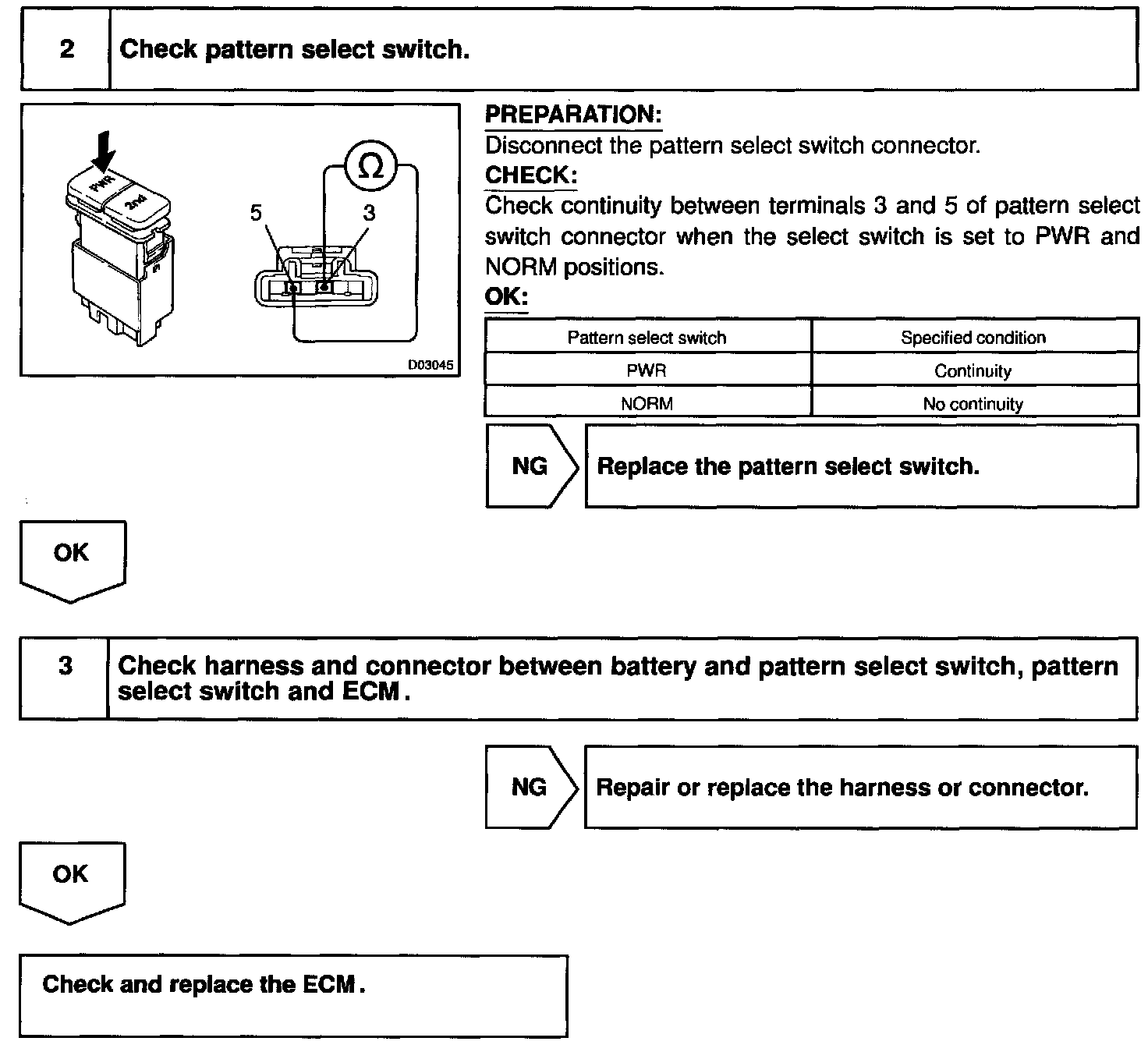 The ECM memory contains the shift programs for the NORMAL and POWER patterns, 2 position, L position and the lock-up patterns. Following the programs corresponding to the signals from the pattern select switch, the park/neutral position and other various sensors, the ECM switches the solenoid valves ON and OFF, and controls the transmission gear change and the lock-up clutch operation.