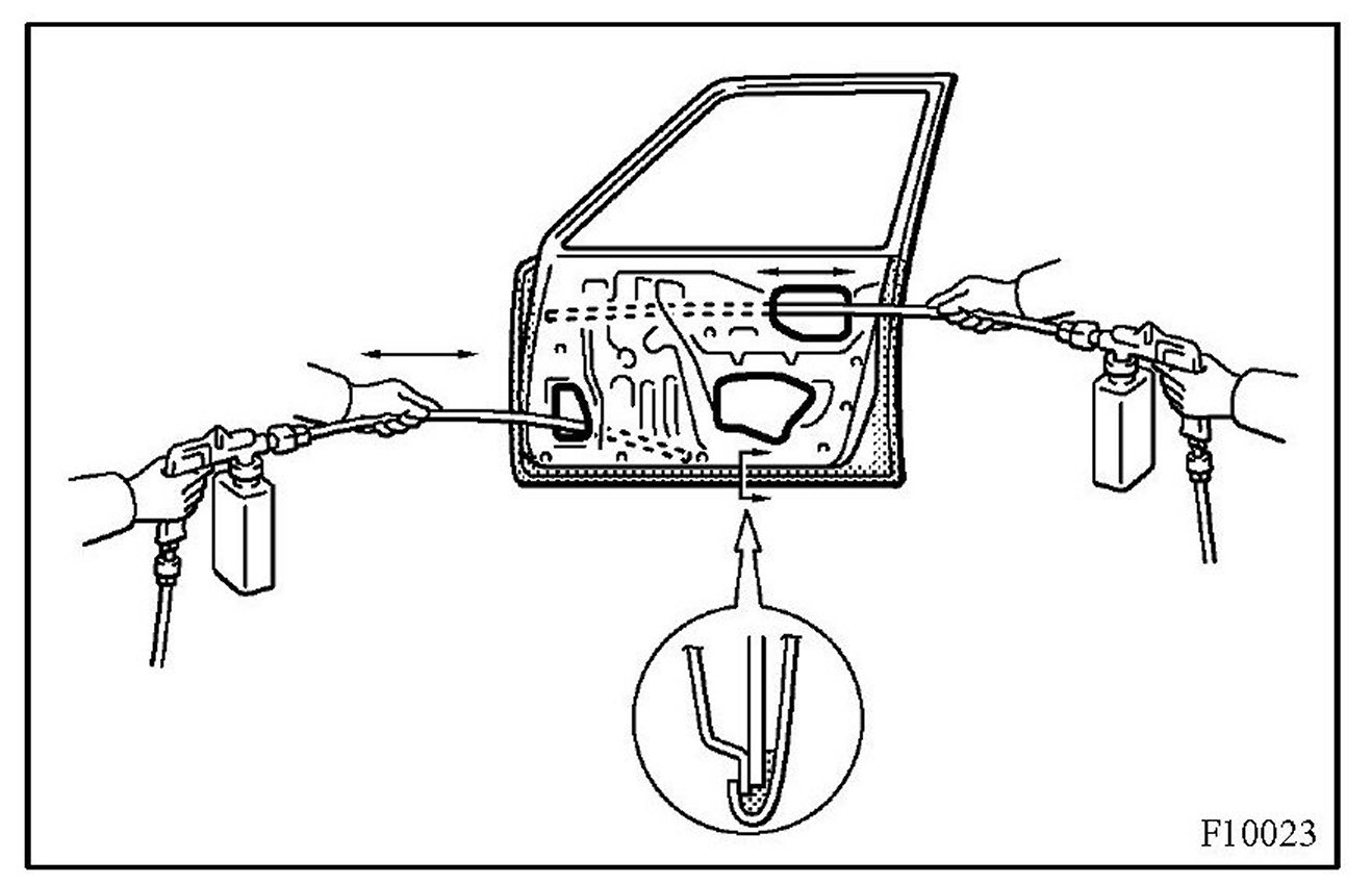 2. To preserve impossible to paint areas from corrosion, always apply sufficient anti-rust agent (wax) to the inside of the hemming areas of the doors and hoods, and around the hinges, or the welded surfaces inside the boxed cross-section structure of the side member, body pillar, etc.