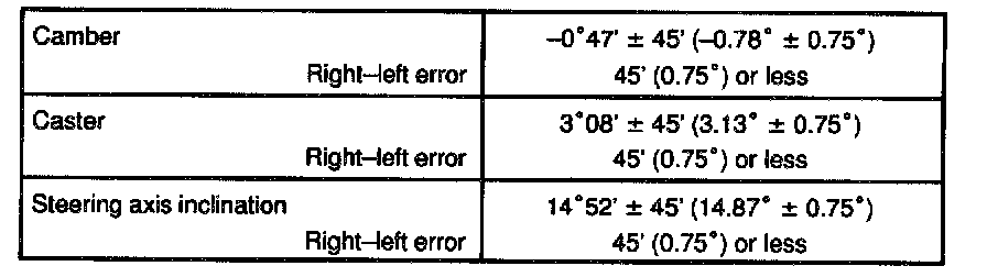If the caster and steering axis inclination are not within the specified values, after the camber has been correctly adjusted, recheck the suspension parts for damaged and/or worn out parts.