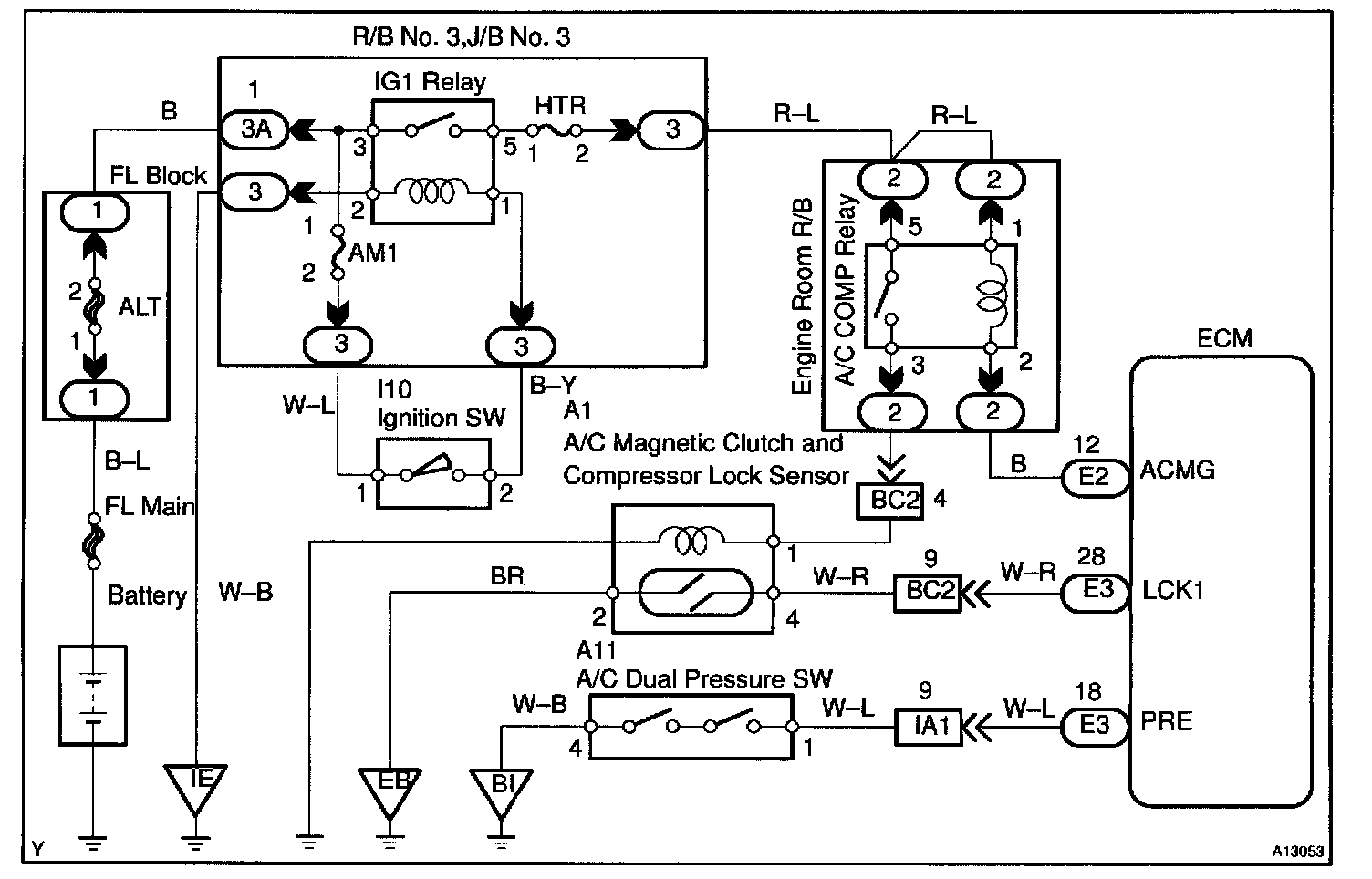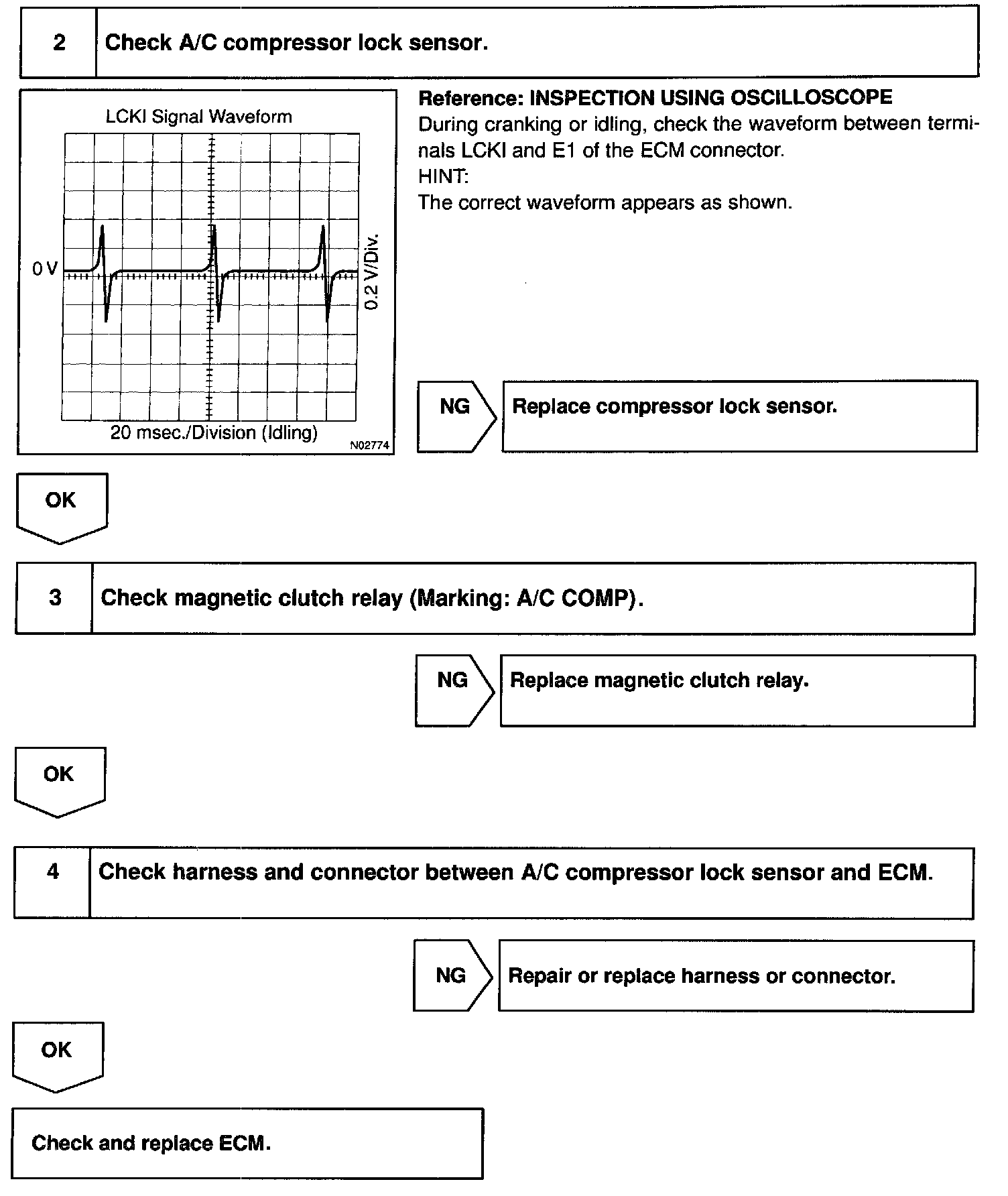 CIRCUIT DESCRIPTIONThis sensor sends 1 pulse par engine revolution to the ECM If the number ratio of the compressor speed divided by the engine speed is smaller than a predetermined value, the ECM turns the compressor off. And, the indicator flashes at about 1 second interval.