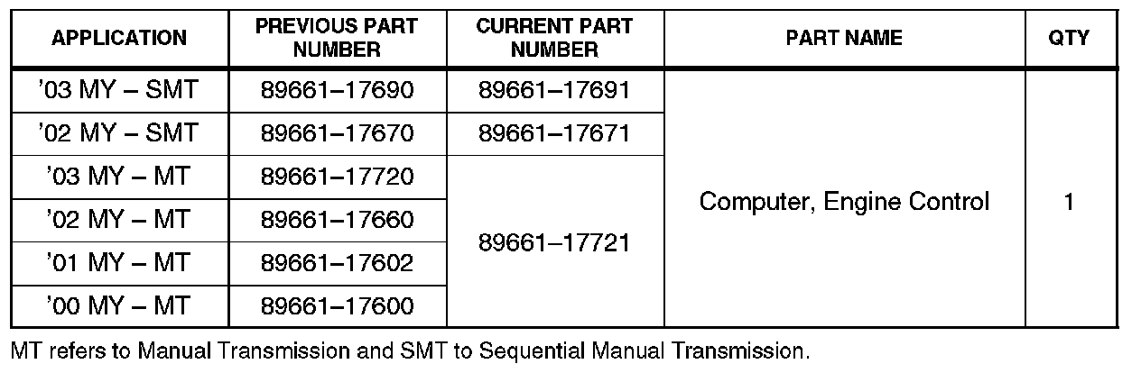 Some MR2 Spyder vehicles may exhibit a M.I.L. "ON" condition with Diagnostic Trouble Code P0300 stored in the Engine Control Module or ECM (SAE term: Powertrain Control Module/PCM). In some of these cases, standard misfire repair methods may not uncover any identifiable sources of misfire. An updated ECM (PCM) has been made available to prevent repeat occurrences of this M.I.L. "ON" condition.