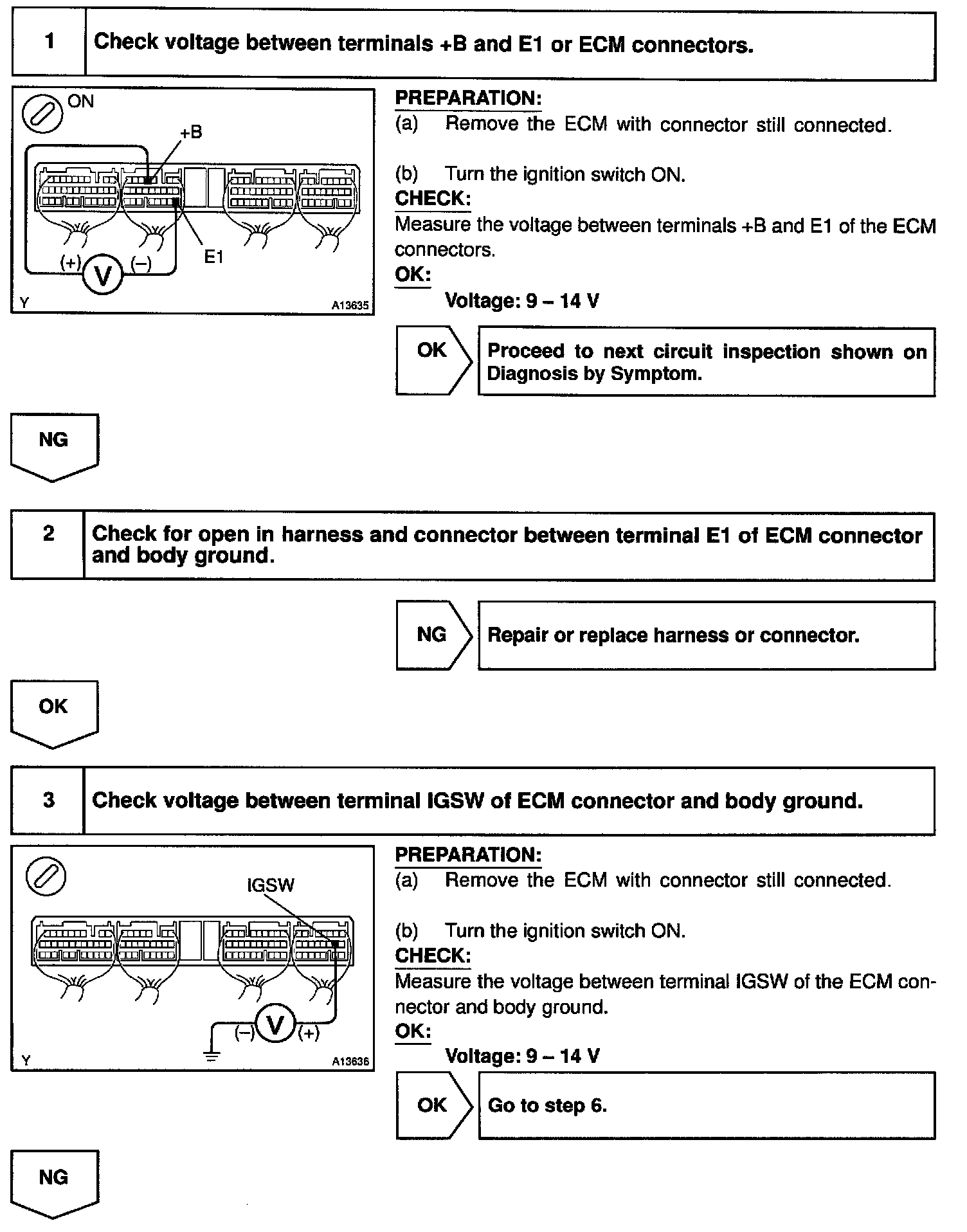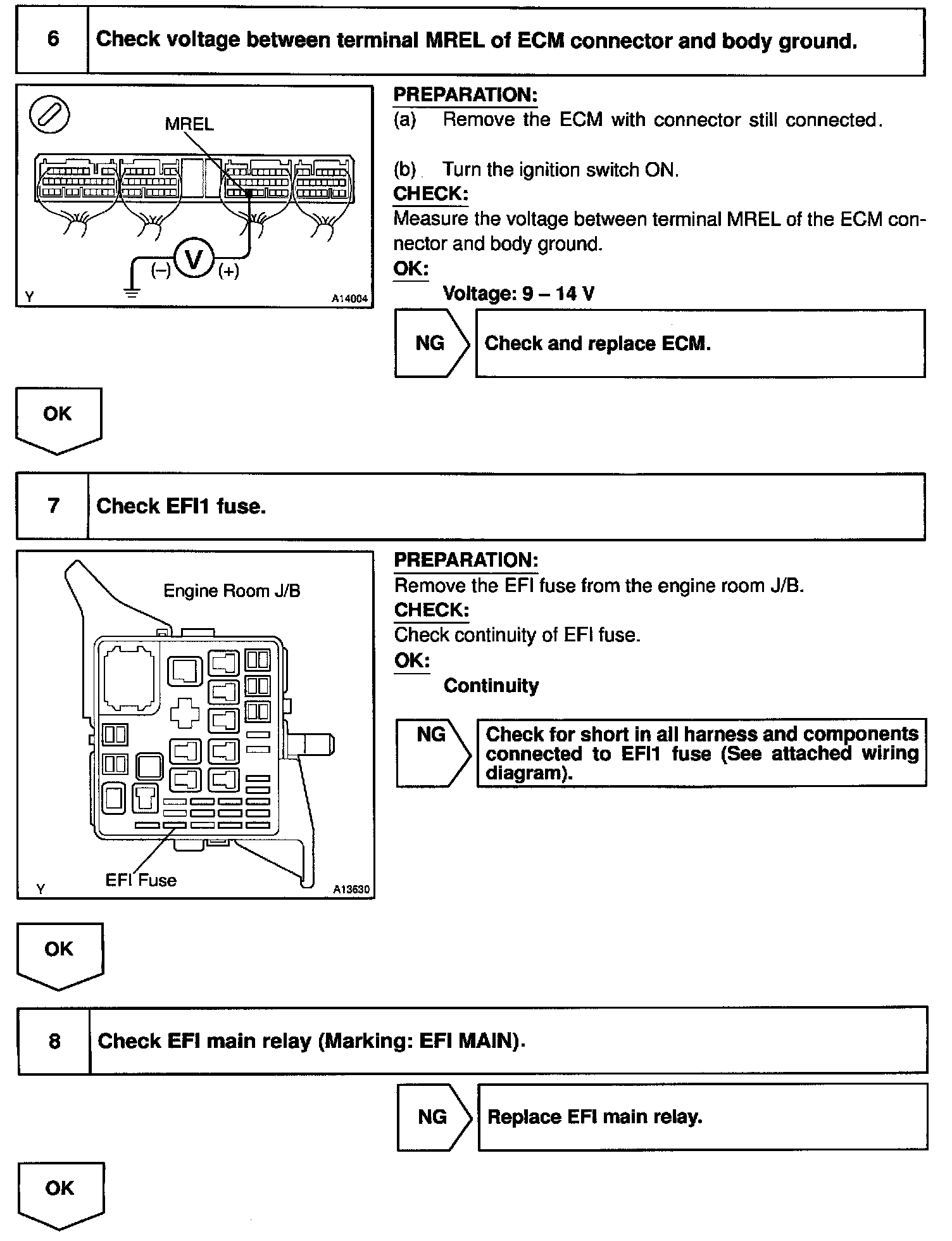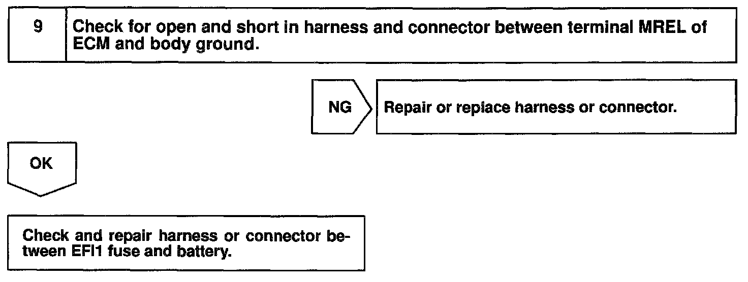 This signal causes current to flow to the coil, closing the contacts of the EFI main relay and supplying power to terminals +B of the ECM.