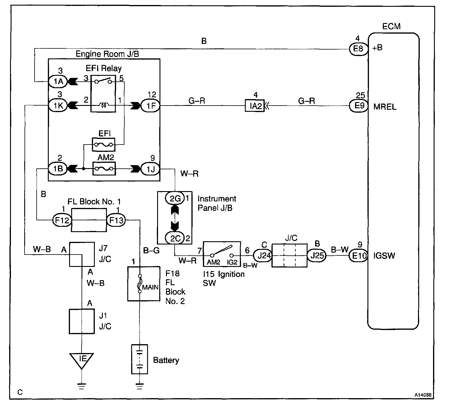 When the ignition switch is turned on, battery positive voltage is applied to IG2 Relay, terminal IGSW of the ECM and the EFI main relay (Marking: EFI MAIN) control circuit in the ECM sends a signal to terminal MREL of the ECM switching on the EFI main relay.