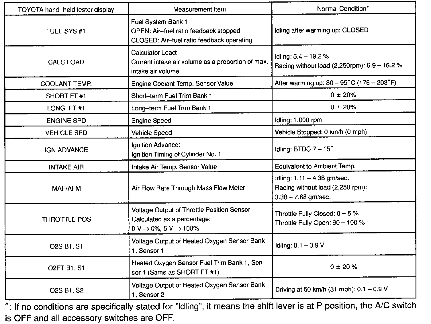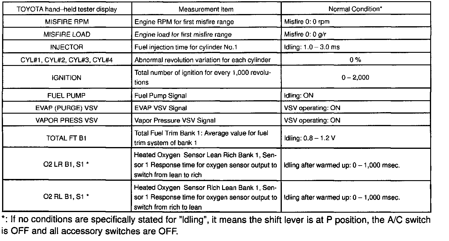 NORMAL ENGINE OPERATING CONDITIONNOTE: The values given for "Normal Condition" are representative values, so a vehicle may still be normal even if its value varies from those listed here. So do not decide whether a part is faulty or not solely according to the "Normal Condition" here.