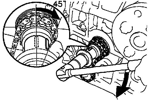 NOTICE: Under the condition with the timing chain cover removed, in case of rotating the camshafts, make the position of the crankshaft rotated clockwise by about 45° from TDC/compression of No. 1 cylinder.