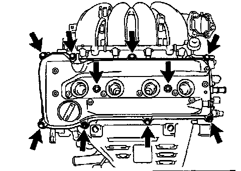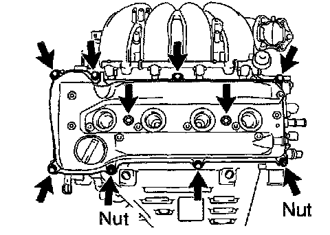 b. Remove the 8 bolts, 2 nuts, cylinder head cover and gasket.
