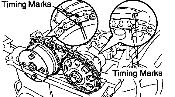 b. Check that the timing marks of the camshaft timing sprocket and VVT timing sprocket are aligned with the timing marks of the No. 1 and No. 2 bearing caps as shown in the illustration.
