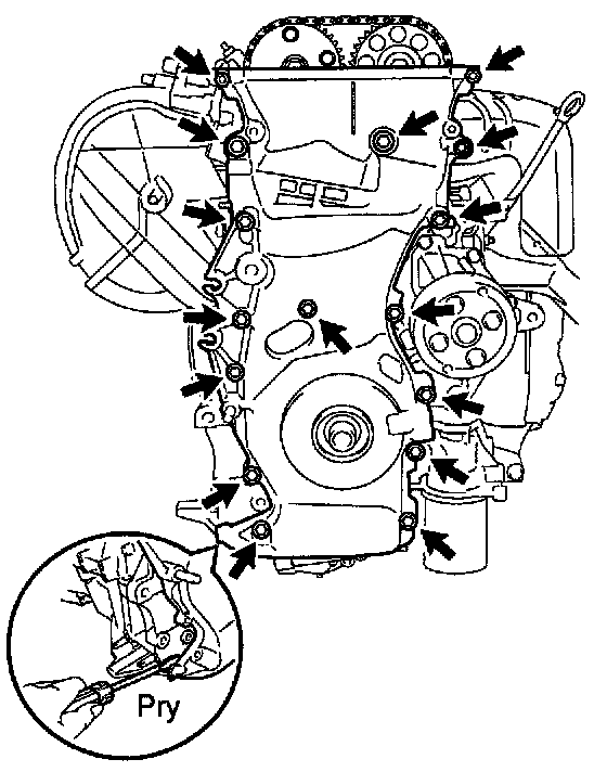 c. Using a screwdriver, pry between the timing chain cover and cylinder head or cylinder block.