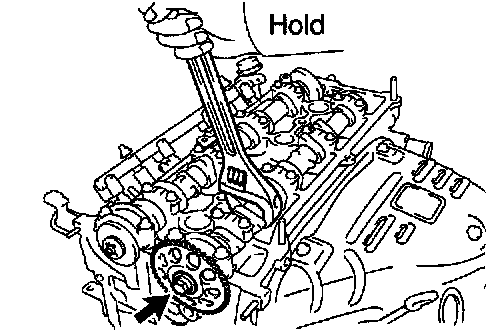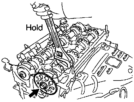 a. Hold the hexagonal head wrench portion of the camshaft with a wrench, and loosen the sprocket bolts.