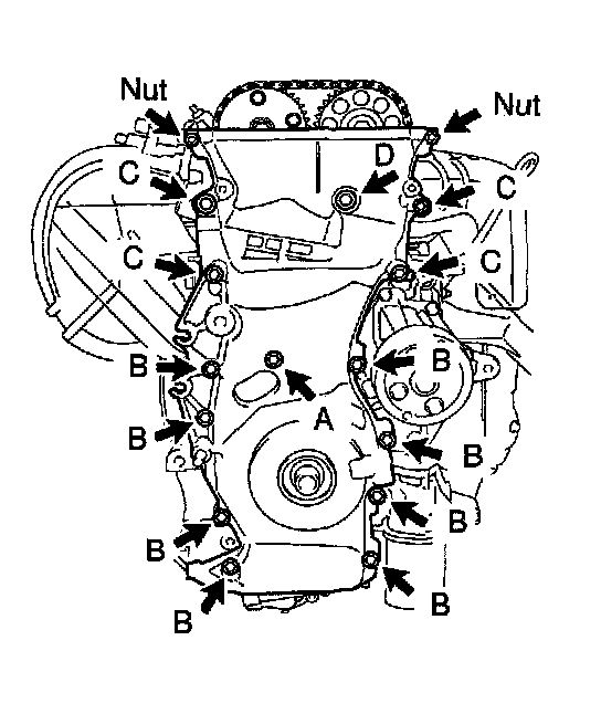 d. Install the timing chain cover with the 14 bolts and 2 nuts. Uniformly tighten the bolts and nuts in several passes.
