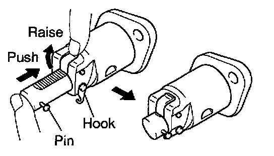 a. Release the ratchet pawl, fully push in the plunger and apply the hook to the pin so that the plunger cannot spring out.