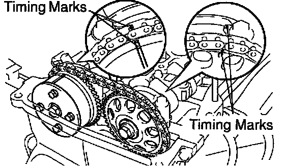 a. Turn the hexagonal wrench head portion of the camshafts, and align the timing marks of the camshaft timing sprocket and VVT timing sprocket with the timing marks of No 1 and No. 2 bearing caps as shown in the illustration.