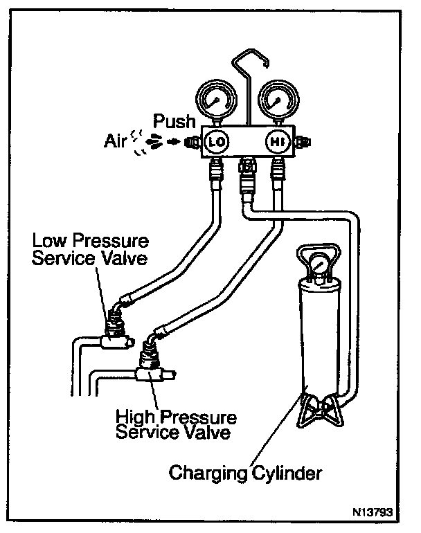- Never run the engine when charging the system through the high pressure side.