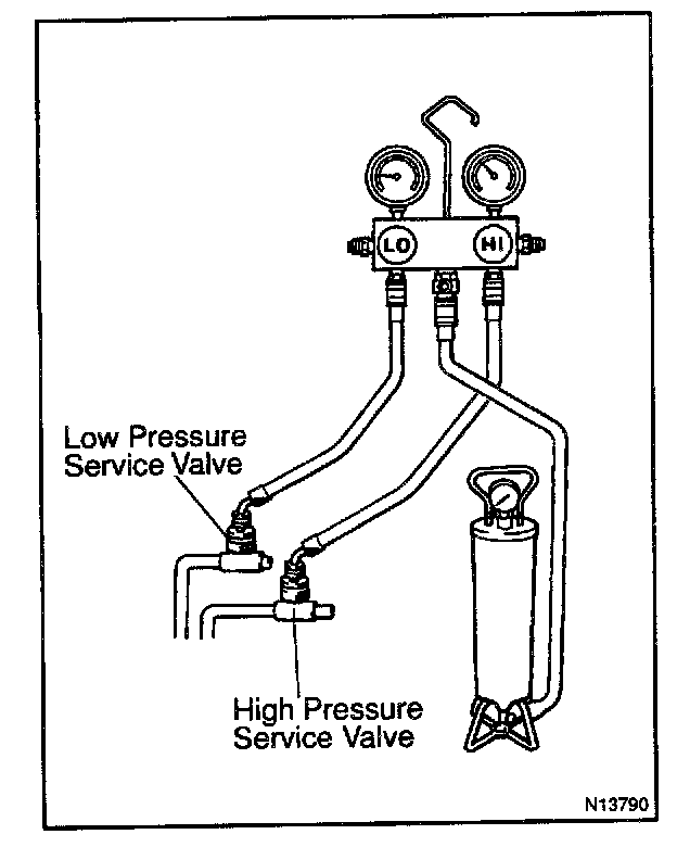 CAUTION: Do not open both high and low hand valves of manifold gauge set.