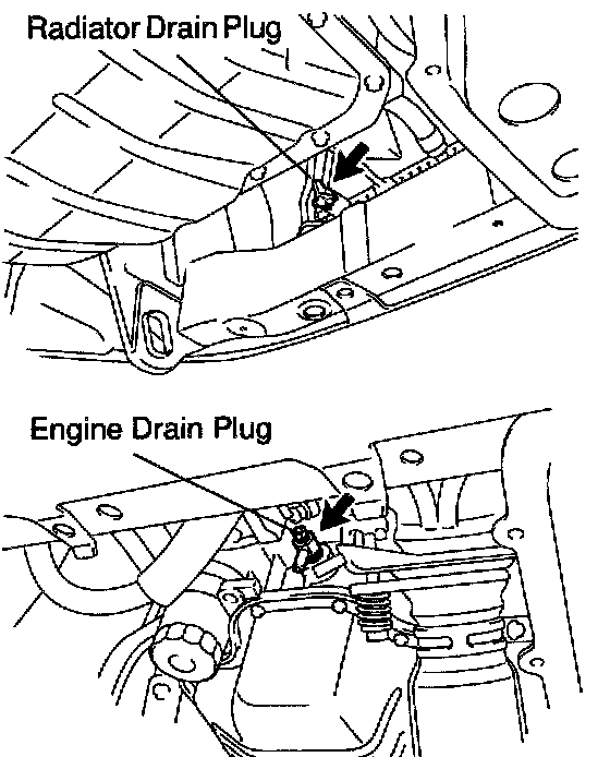 b. Loosen the radiator drain plug (on the left side of the radiator lower tank) and engine drain plug, and drain the coolant.