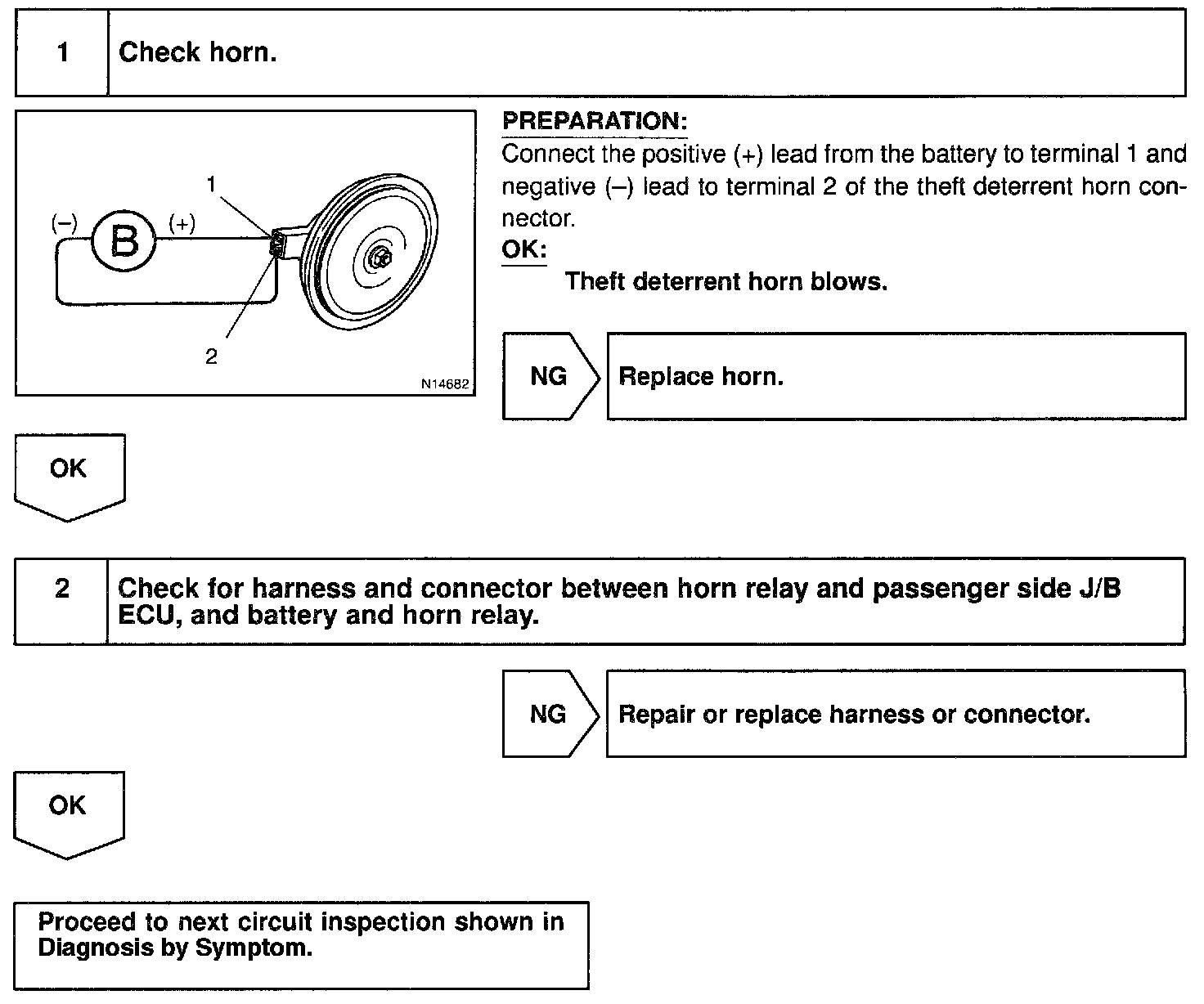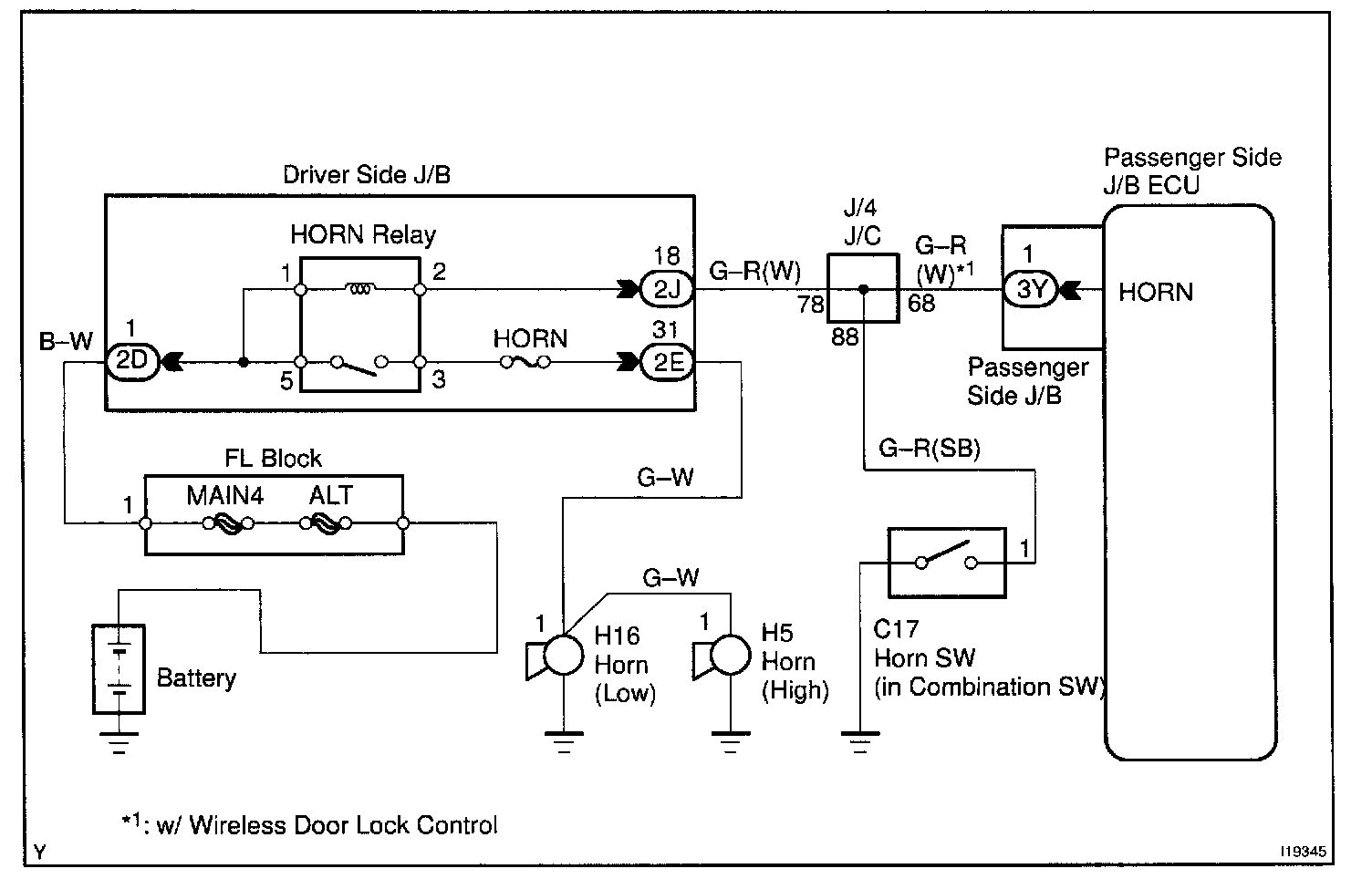The horn is connected to the passenger side J/B ECU and activated by the passenger side J/B ECU when the panic button of the wireless door lock system is pressed
