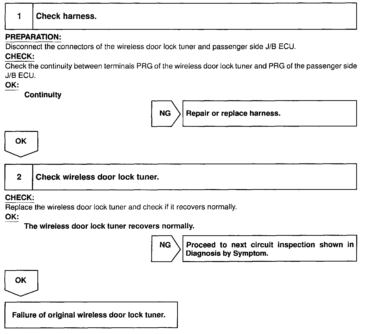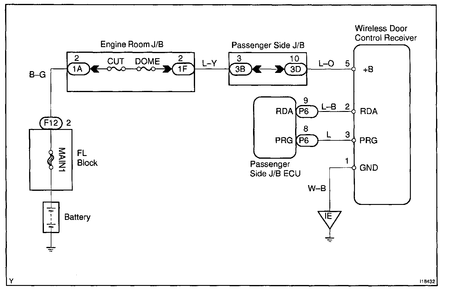 CIRCUIT DESCRIPTIONThe signal from the transmitter will be input to the passenger side J/B ECU through the RDA line. The RDA line is diagnosed by the passenger side J/B ECU, so check the DTC as well in case of the failure of the wireless function.