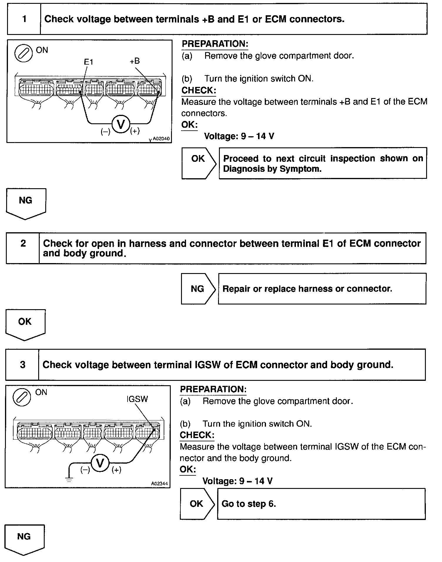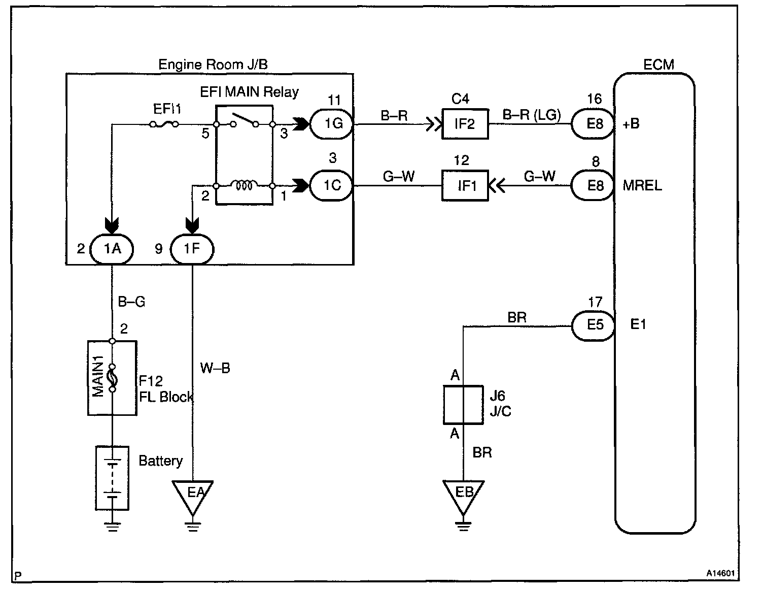 This signal causes current to flow to the coil, cutting off the contacts of the EFI main relay and supplying power to terminals +B of the ECM.