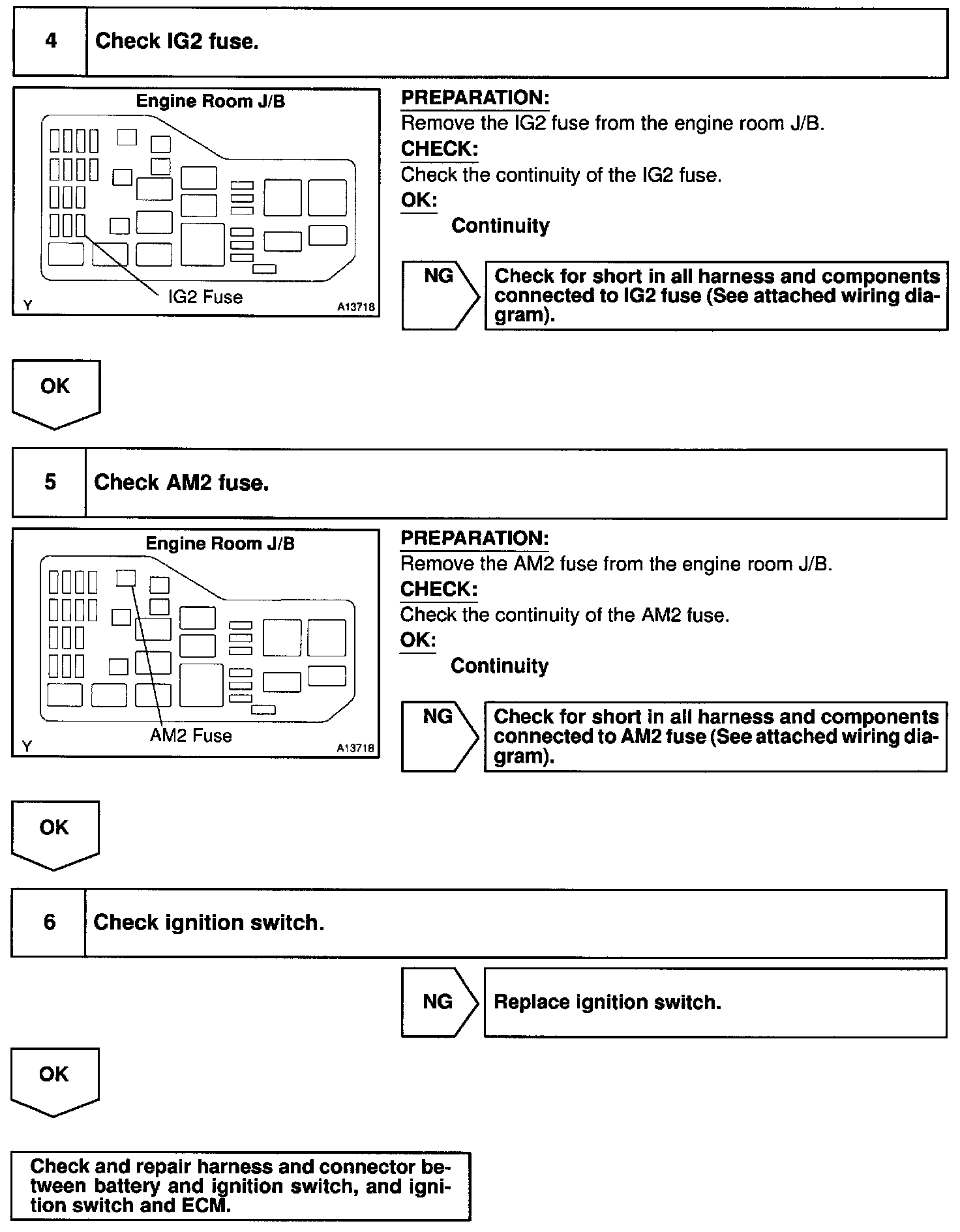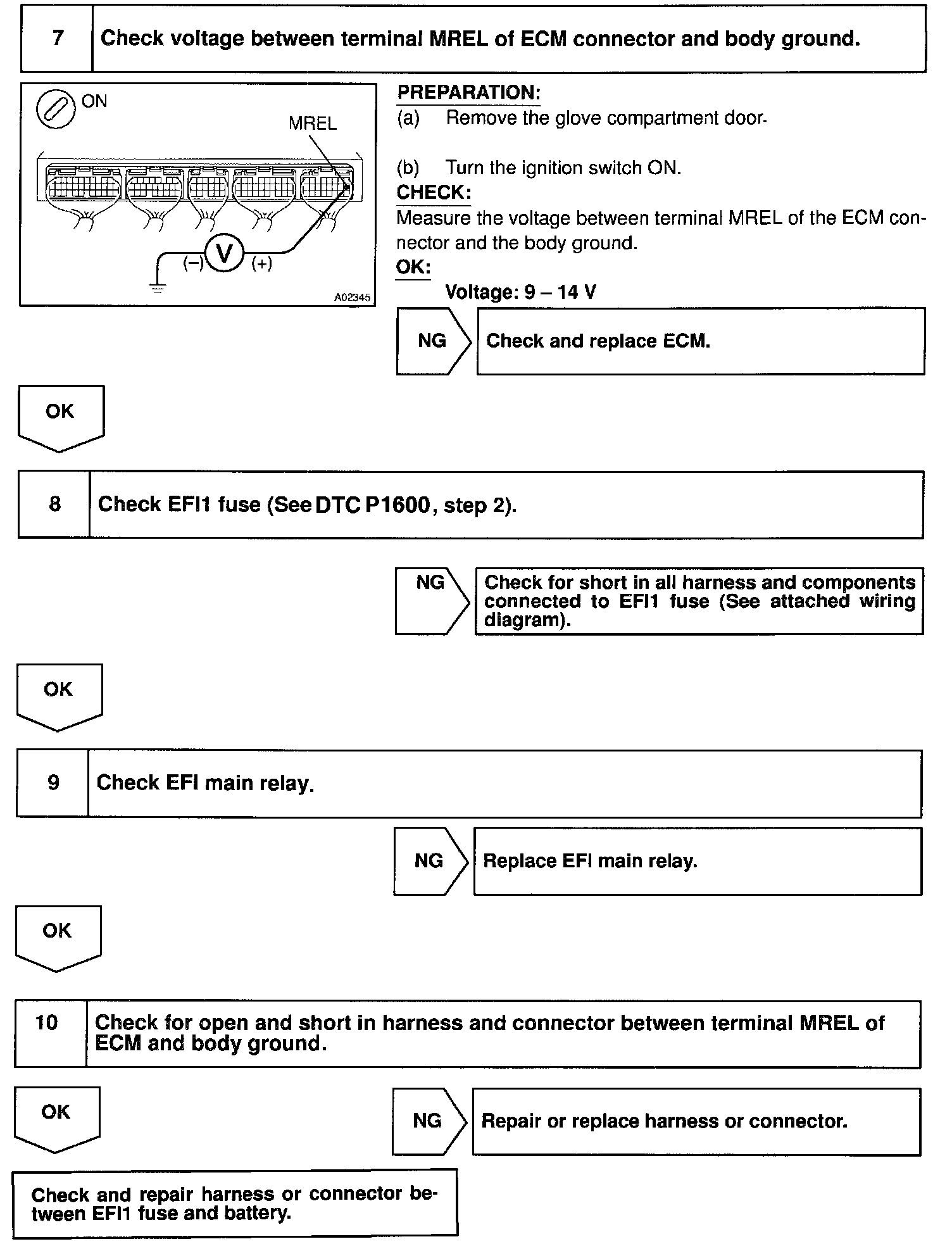 When the ignition switch is turned on, battery positive voltage is applied to IG2 Relay, terminal IGSW of the ECM and the EFI main relay control circuit in the ECM sends a signal to terminal MREL of the ECM by switching on the EFI main relay.