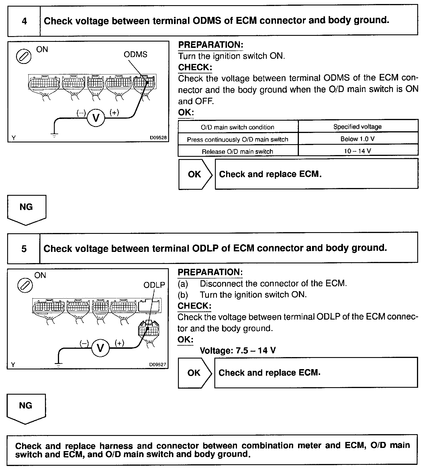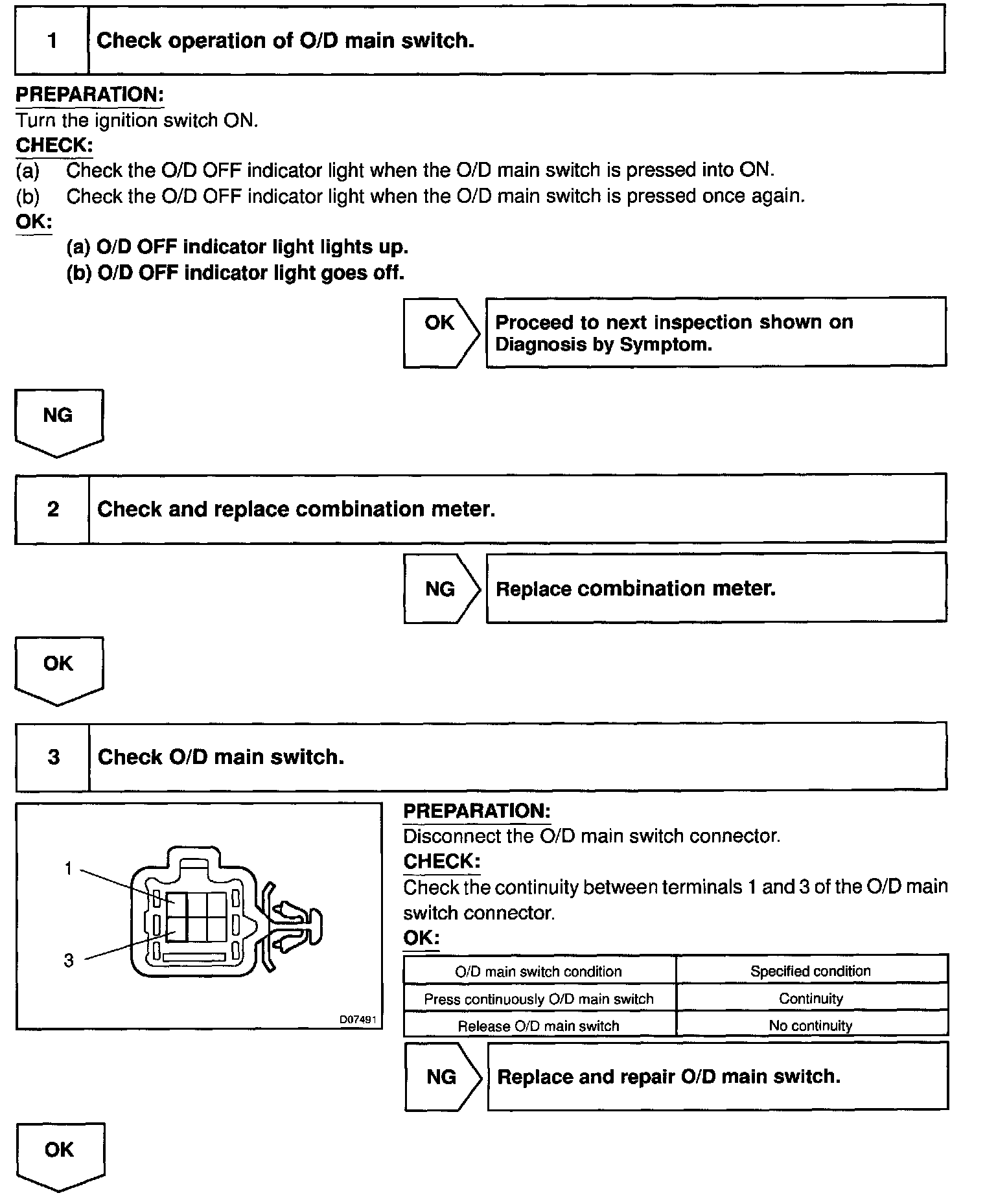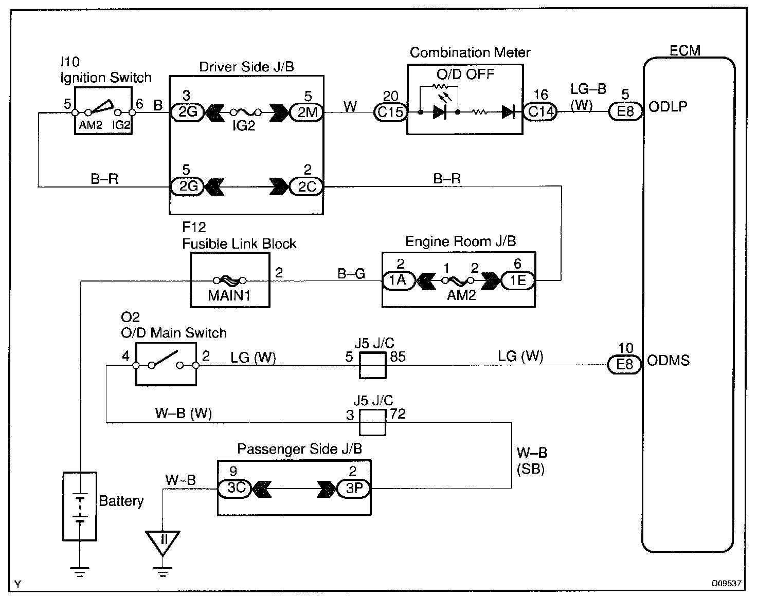 CIRCUIT DESCRIPTIONThe O/D main switch is a momentary type switch. When pressing the O/D main switch, the O/D OFF indicator light lights up and the ECM prohibits shifting into O/D, and when pressing it once again, the O/D OFF indicator light goes off and the ECM allows shifting into O/D. Turning the IG switch OFF will reset the O/D OFF indicator light.