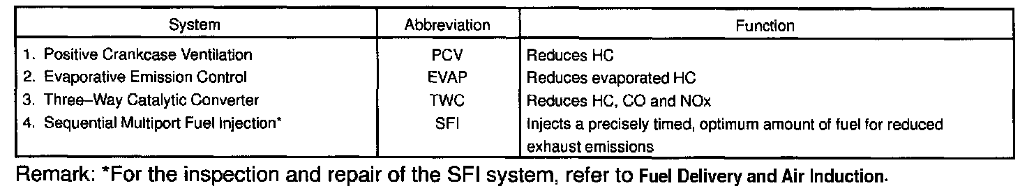 emission control Systems are installed to reduce the amount of CO, HC and NOx exhausted from the engine (3 and 4). they prevent the atmospheric release of blow-by gas-containing HC (1) and evaporated fuel containing HC being released from the