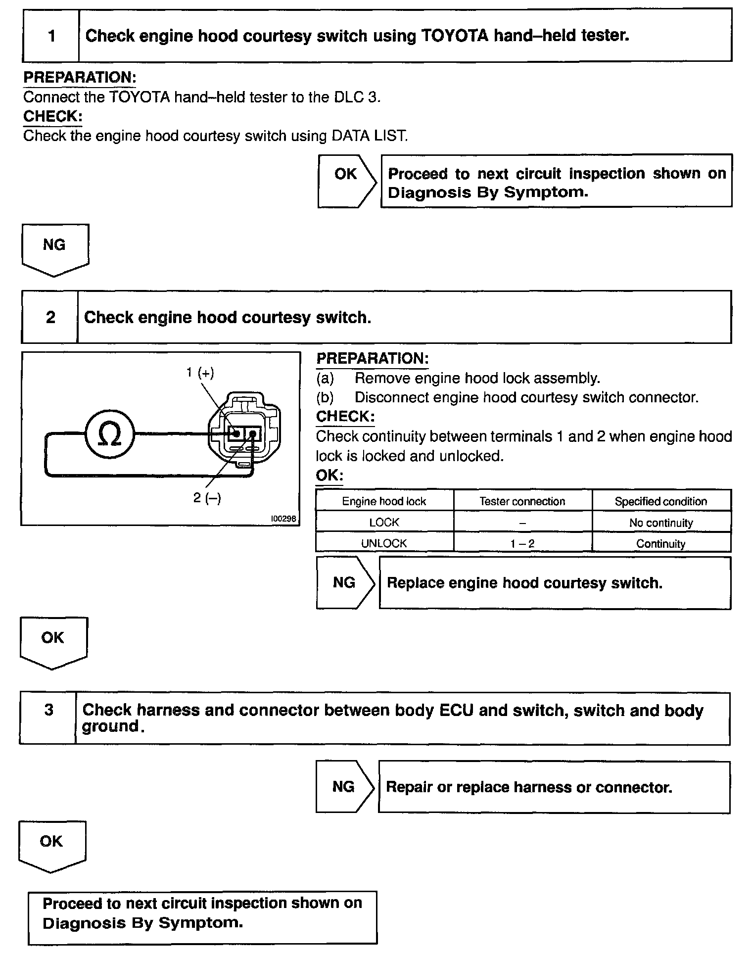 CIRCUIT DESCRIPTIONThe engine hood courtesy switch is built into the engine hood lock assembly and goes ON when the engine hood is opened and goes OFF when the engine hood is closed.