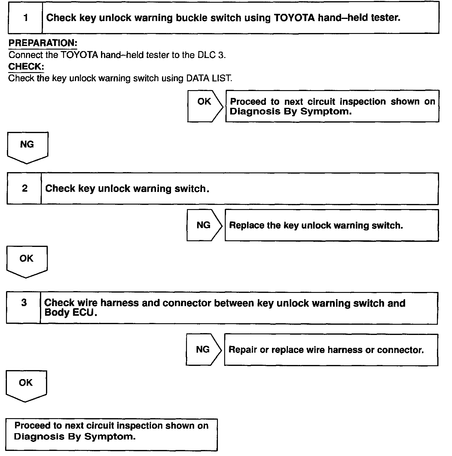 CIRCUIT DESCRIPTIONThe key unlock warning switch goes on when the ignition key is inserted in the key cylinder and goes off when the ignition key is removed.