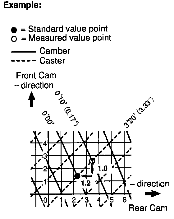 5. As shown in the example chart, read the distance from the measured value to the standard value, and adjust the front and/or rear adjusting cams accordingly.