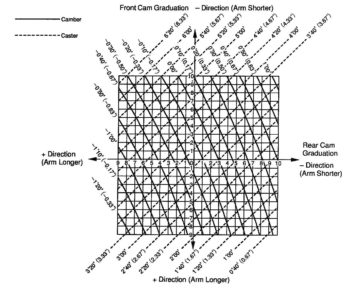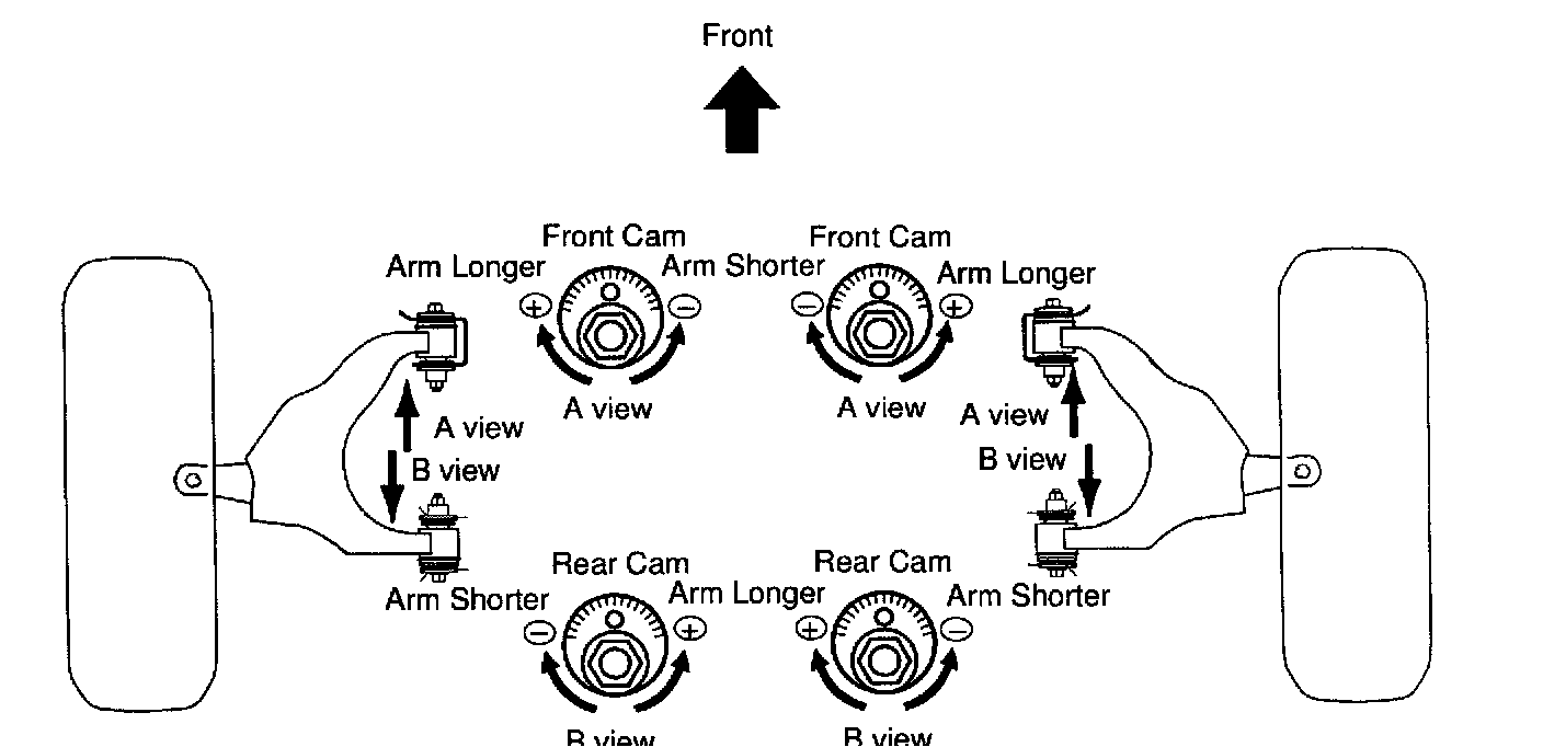 b. Adjust the camber and caster by front and/or rear adjusting cams (See adjustment chart).