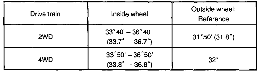 If the right and left wheel turning angles differ from the specified value, readjust the toe-in and wheel angle within the specified value. At this time, make sure that the lengths of the right and left rack ends are the same.