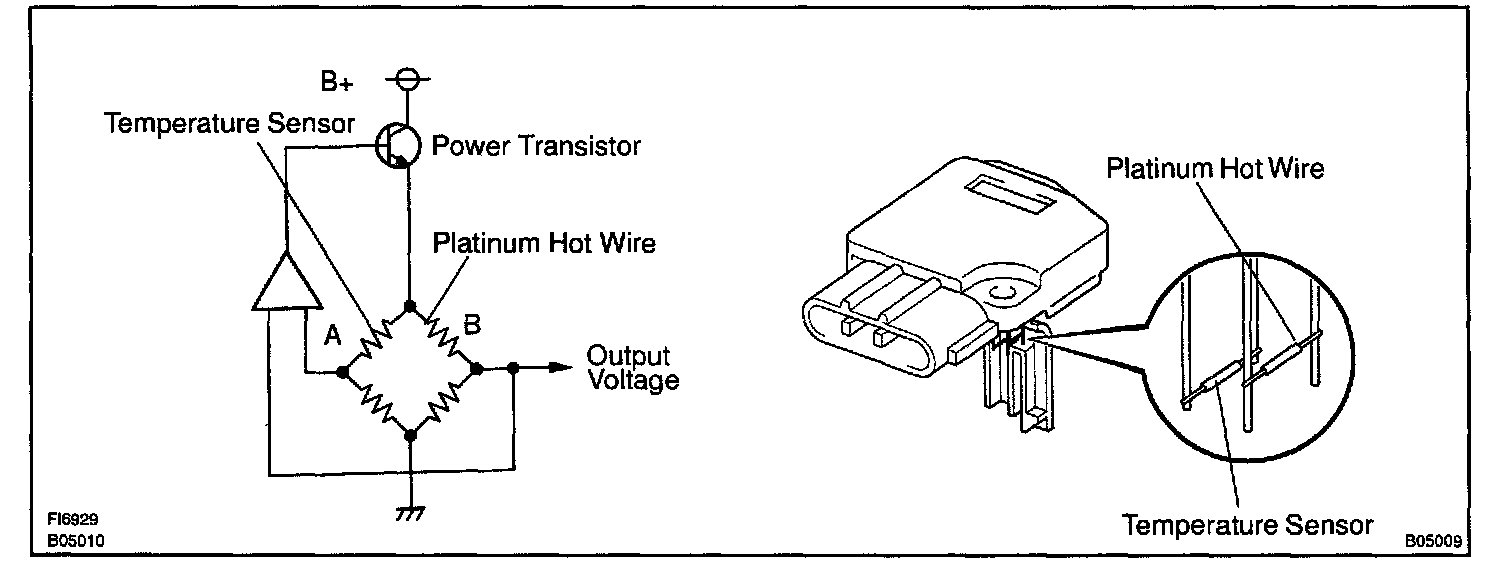 The mass air flow meter uses a platinum hot wire. The hot wire air flow meter consists of a platinum hot wire, temperature sensor and a control circuit installed in a plastic housing. The hot wire air flow meter works on the principle that the hot wire and temperature sensor located in the intake air bypass of the housing detect any changes in the intake air temperature.
